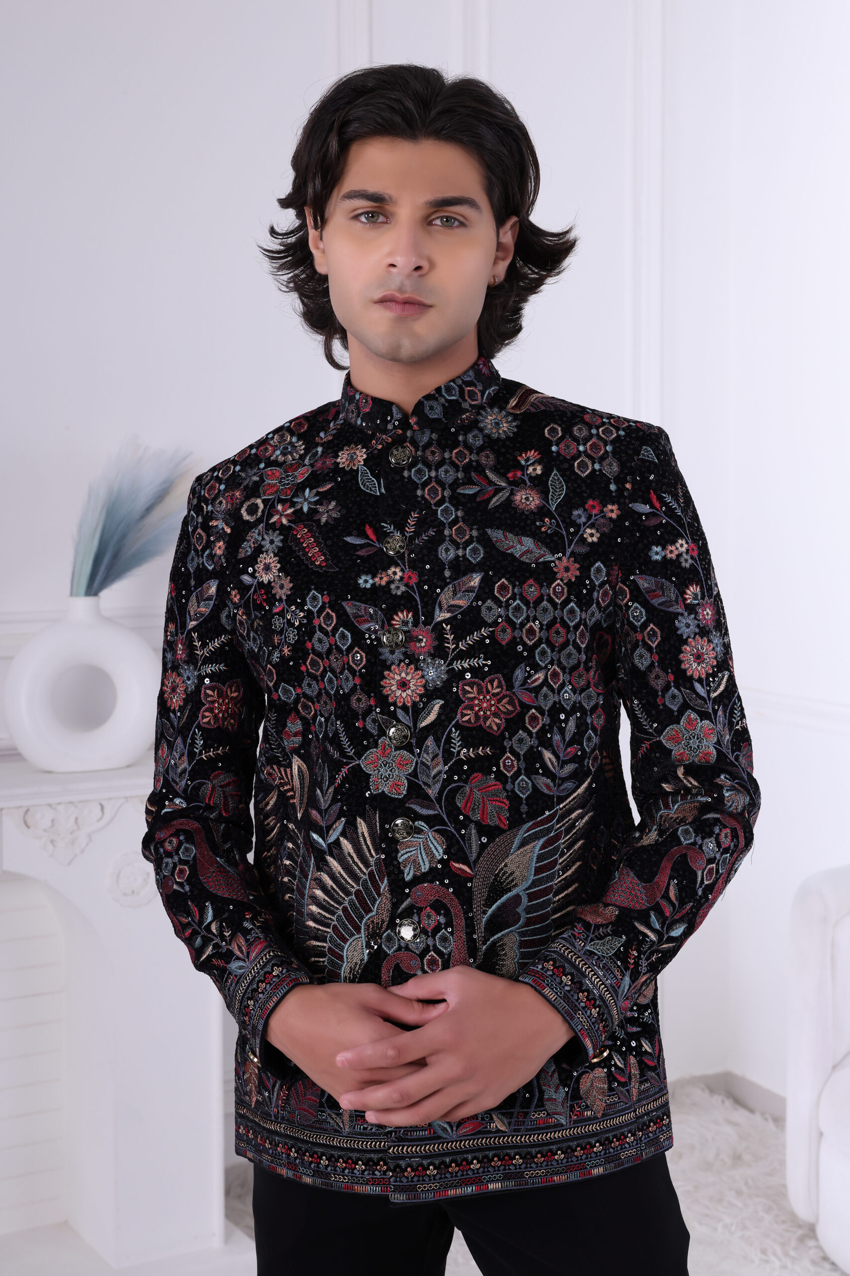 A regal black Jodhpuri suit richly adorned with multicolor embroidery and metallic buttons, perfect for grand weddings and evening celebrations.