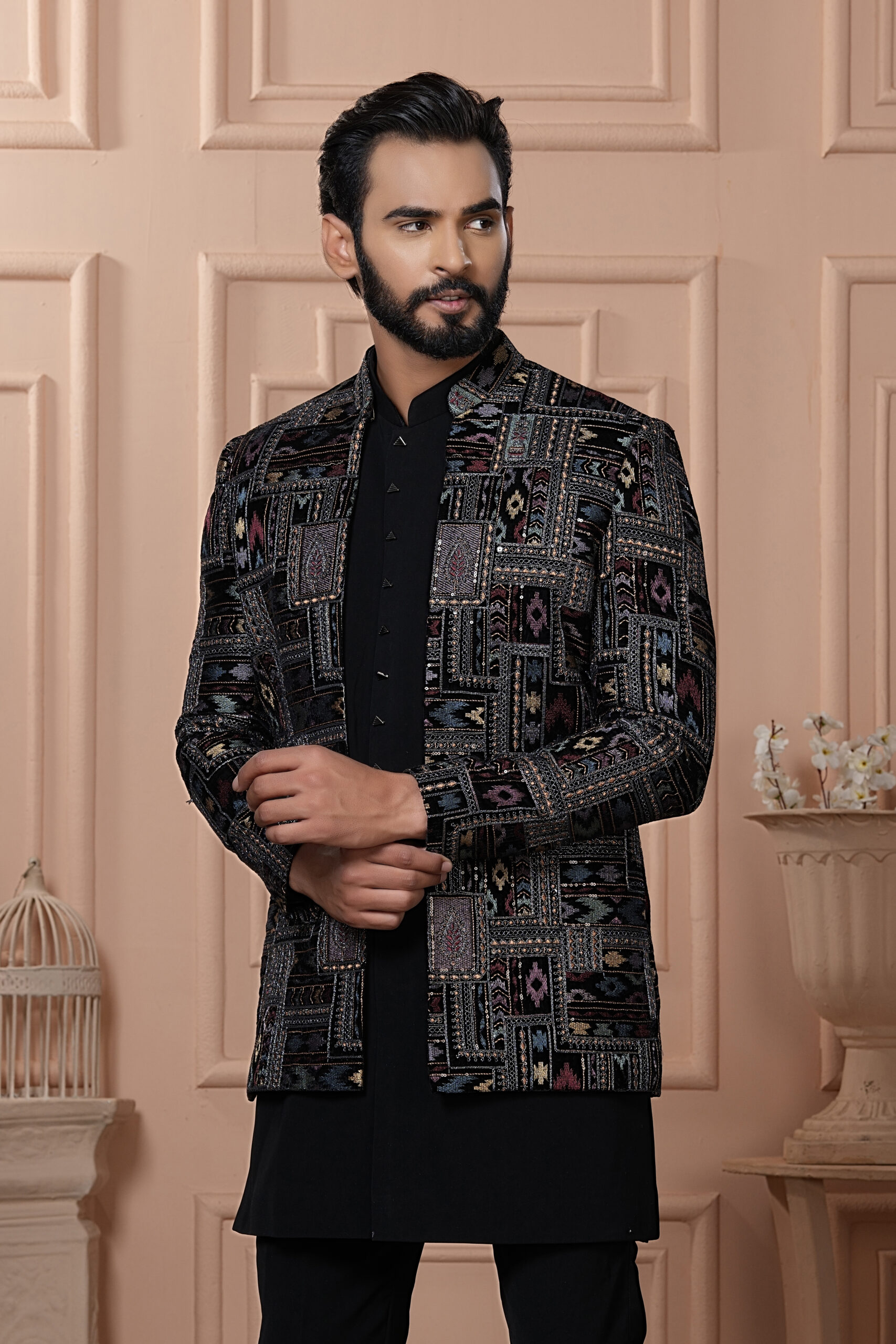 A bold and fashionable black Indo-Western outfit paired with a geometric embroidered jacket. The jacket showcases intricate multi-colored threadwork in a patch-style pattern, adding a modern twist to traditional attire. The sleek black base kurta enhances the rich embroidery, making it perfect for cocktail parties, wedding receptions, or festive gatherings.