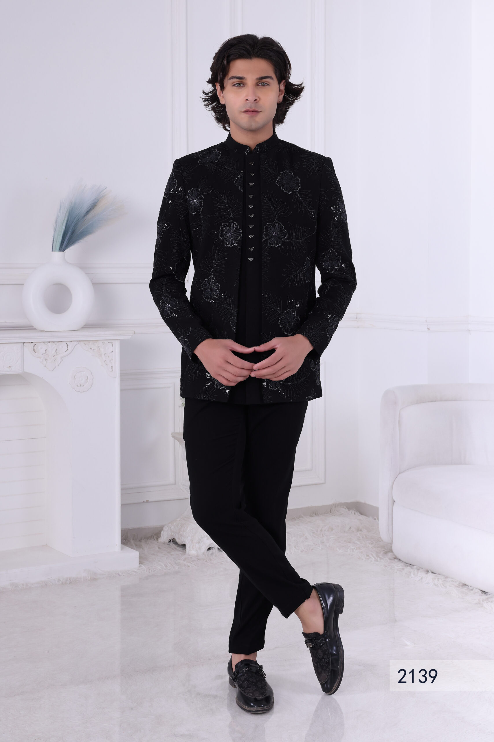 An elegant black Jodhpuri suit crafted with intricate floral embroidery, enhanced by subtle sequins that add a refined shimmer. The front placket is detailed with metallic triangular buttons for a bold, modern touch. A perfect choice for evening receptions, cocktails, and festive celebrations.