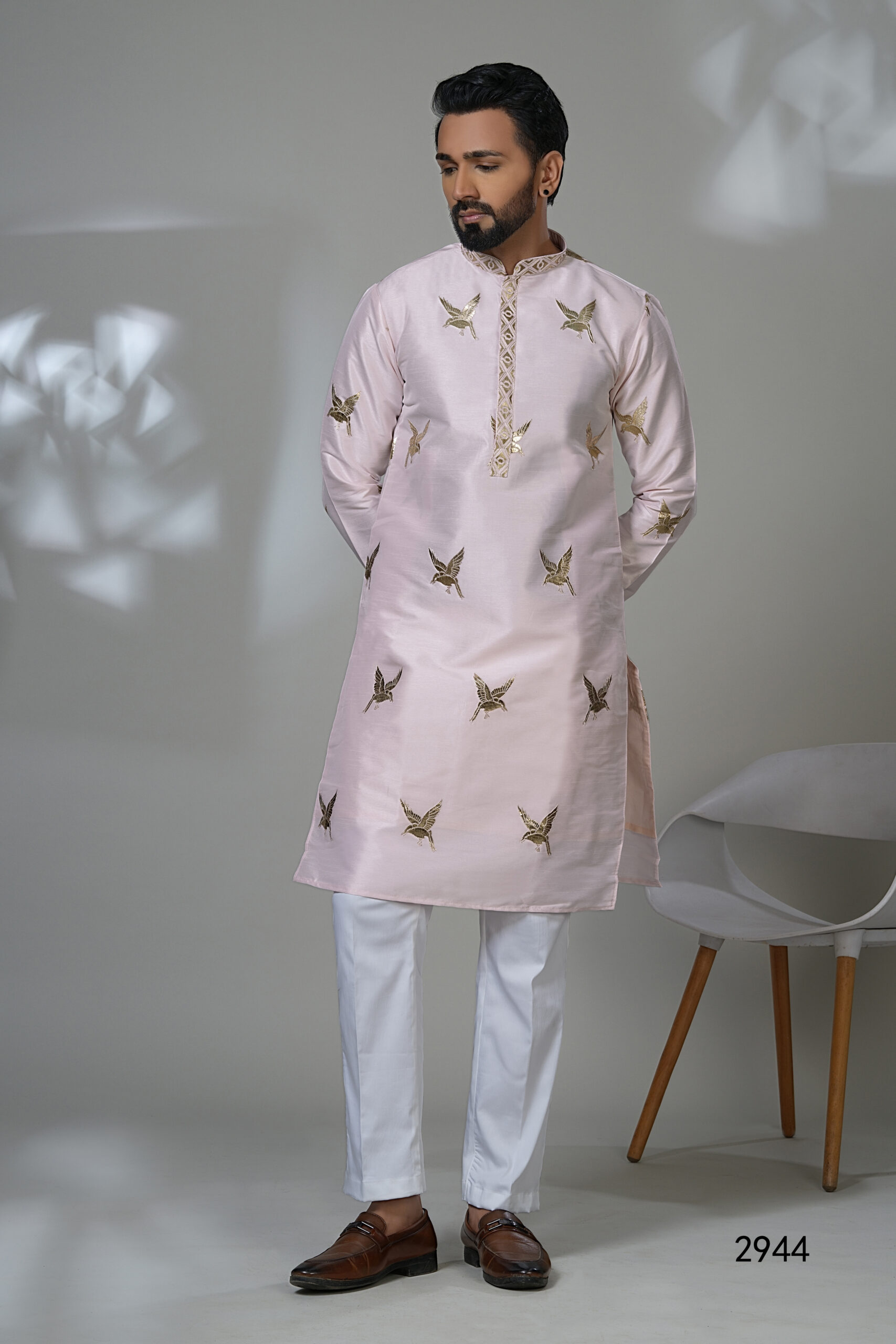 This blush pink kurta brings a refreshing twist to festive wear with its striking golden bird embroidery. Crafted from a silky-smooth fabric, it features elegant detailing on the placket and cuffs, making it a graceful choice for daytime celebrations and special occasions.