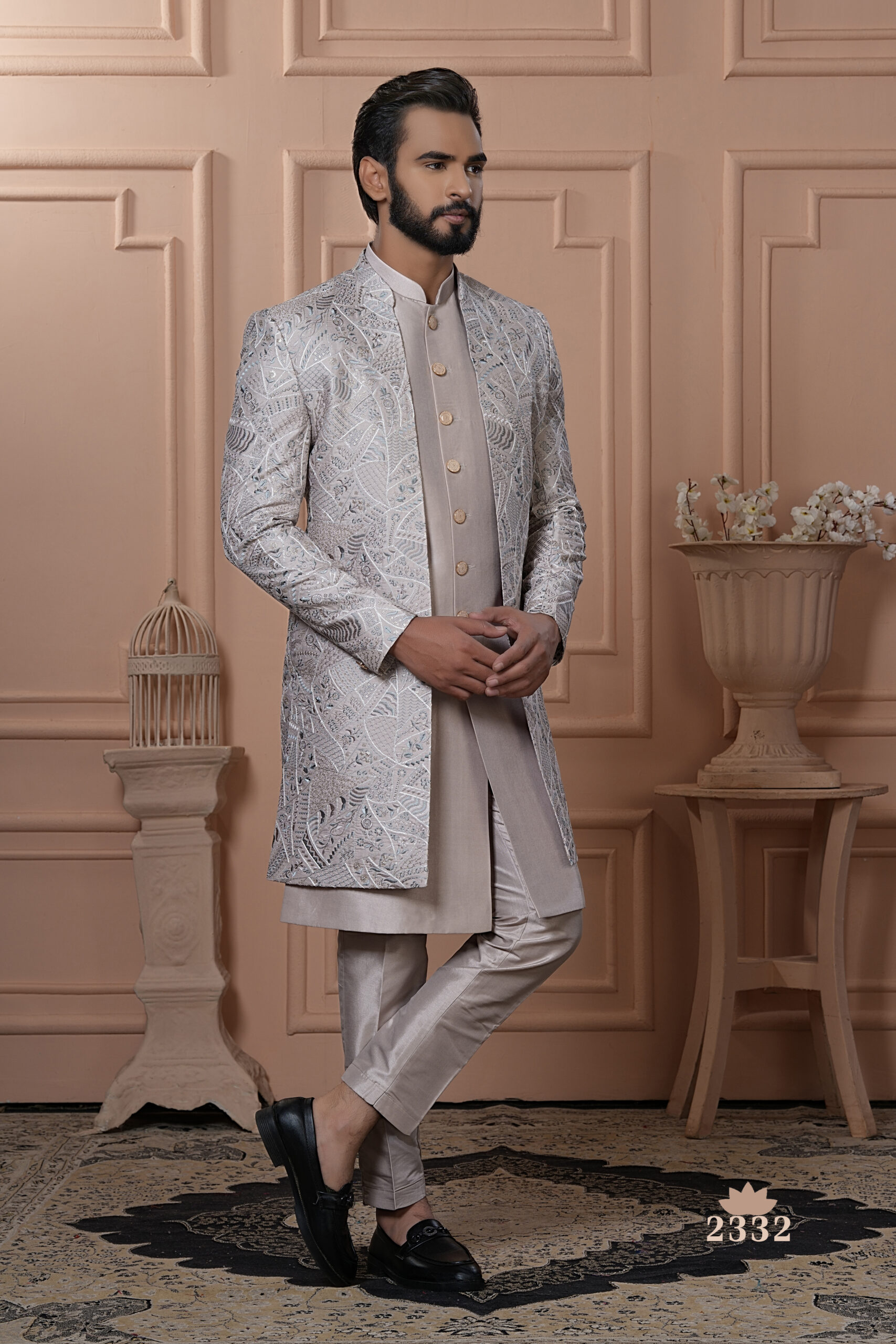 A sophisticated champagne beige Indo-Western featuring a front-open embroidered jacket highlighted with silver threads and sequins, paired with a matching kurta and churidar. The subtle sheen and intricate craftsmanship make it an elegant choice for engagements, receptions, and evening celebrations.