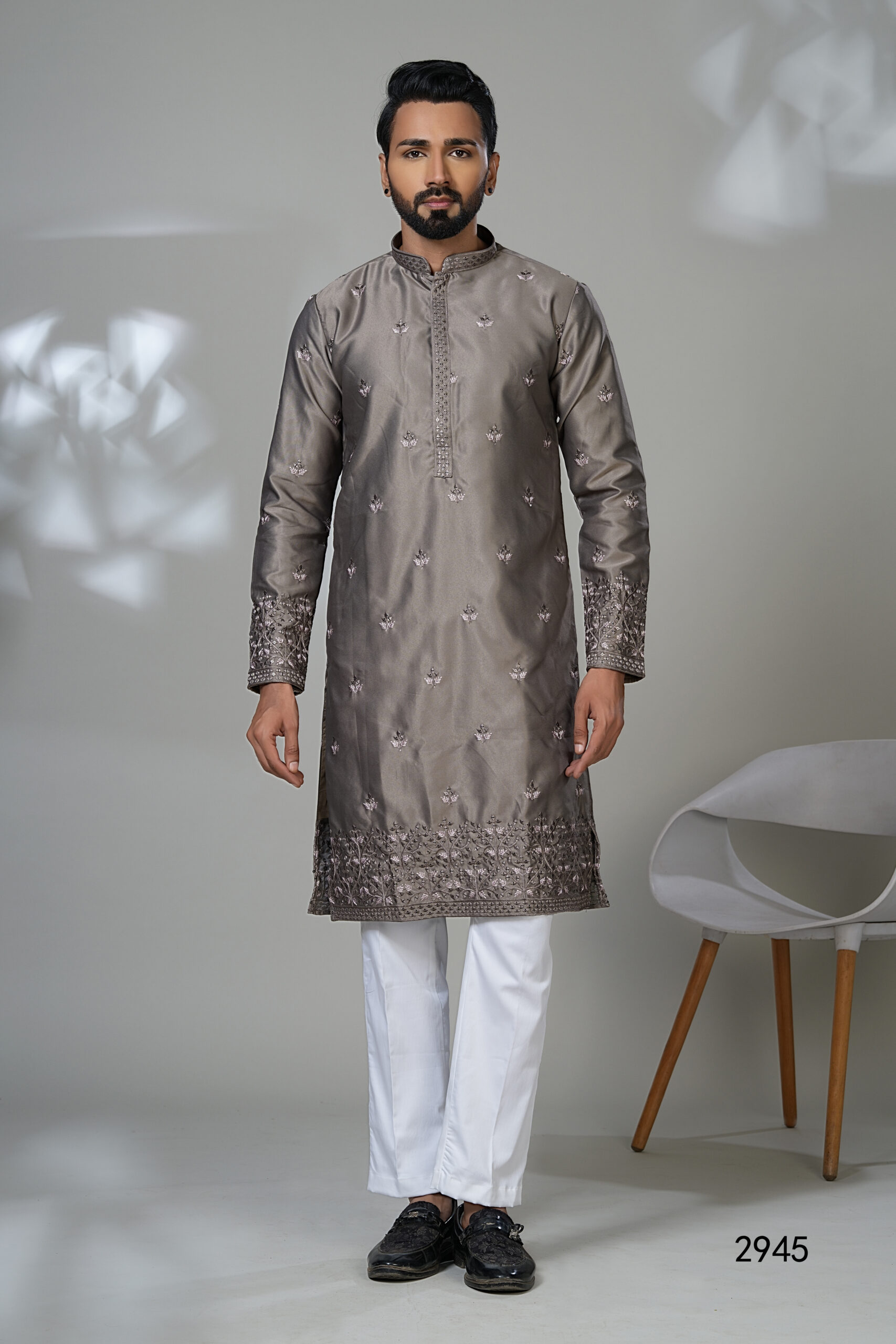 Refined and regal, this charcoal grey kurta is adorned with elegant all-over embroidery and heavily detailed cuffs and hemline. Crafted from a premium fabric with a soft sheen, it’s an ideal pick for formal functions, festive gatherings, or wedding events.