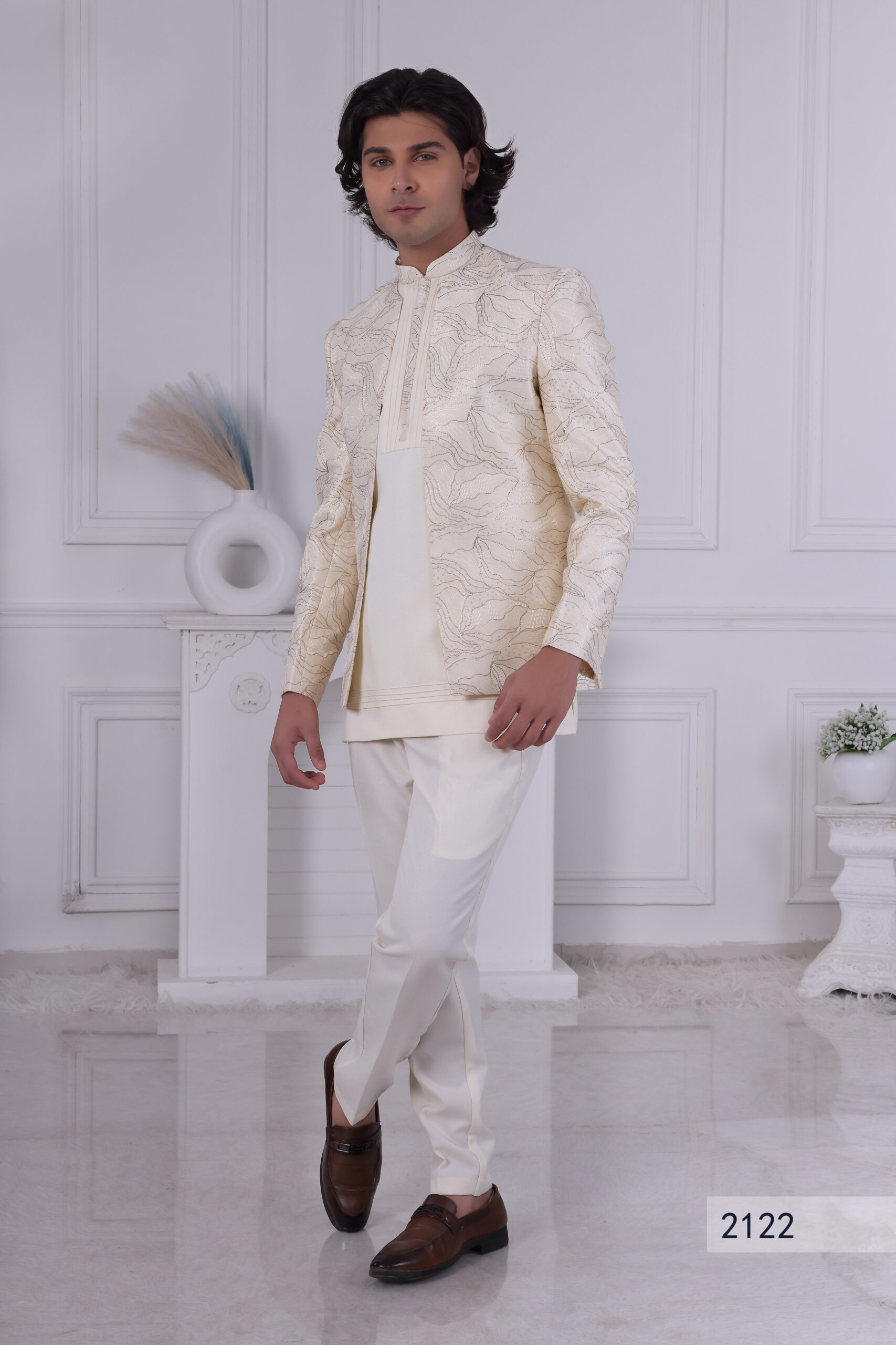 Sophisticated cream Jodhpuri suit with subtle textured patterns and minimalistic design, perfect for elegant celebrations and formal events.