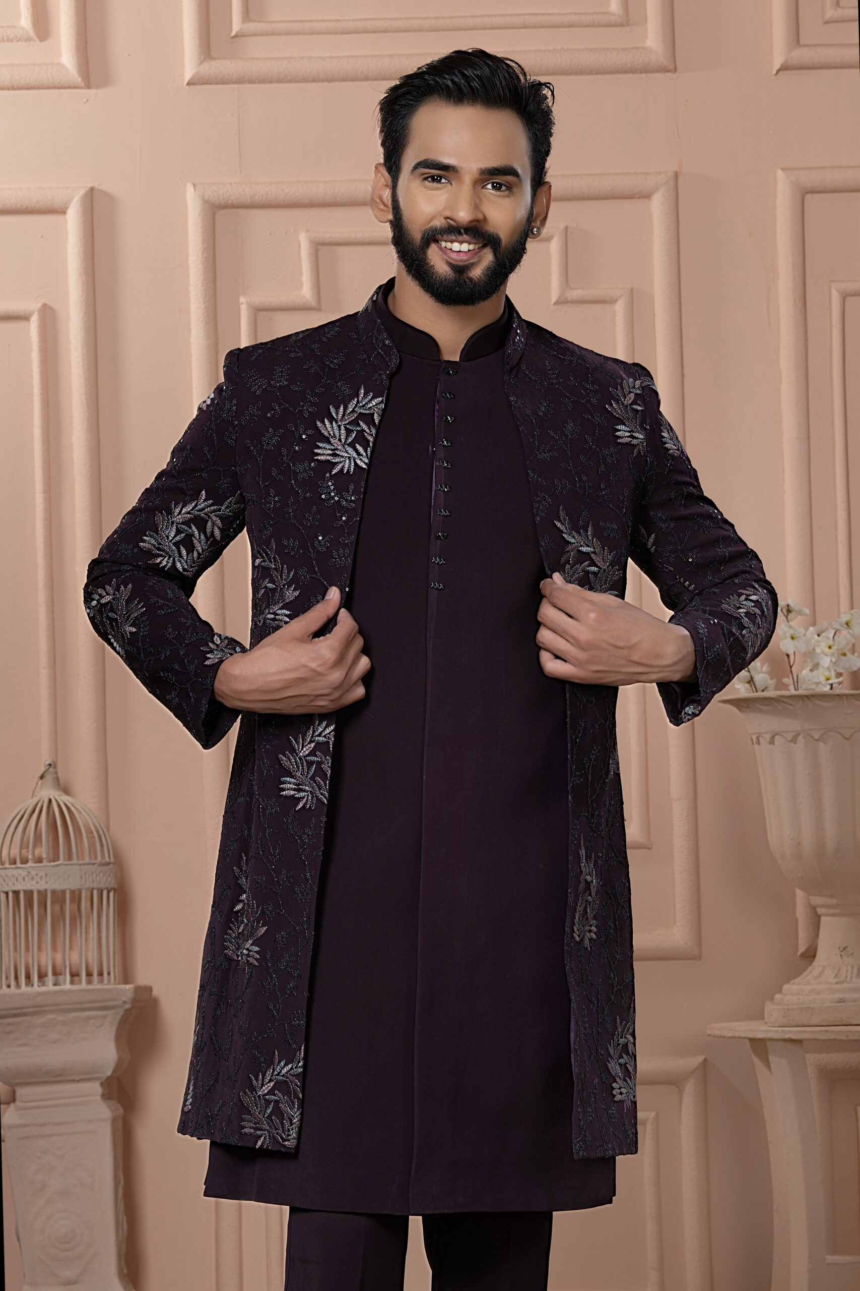 A regal deep plum open Indo-Western ensemble, featuring a front-open embroidered jacket with metallic floral motifs over a matching kurta and trousers. The open-front design adds a contemporary touch while retaining traditional charm, making it a perfect pick for weddings, receptions, and festive occasions.