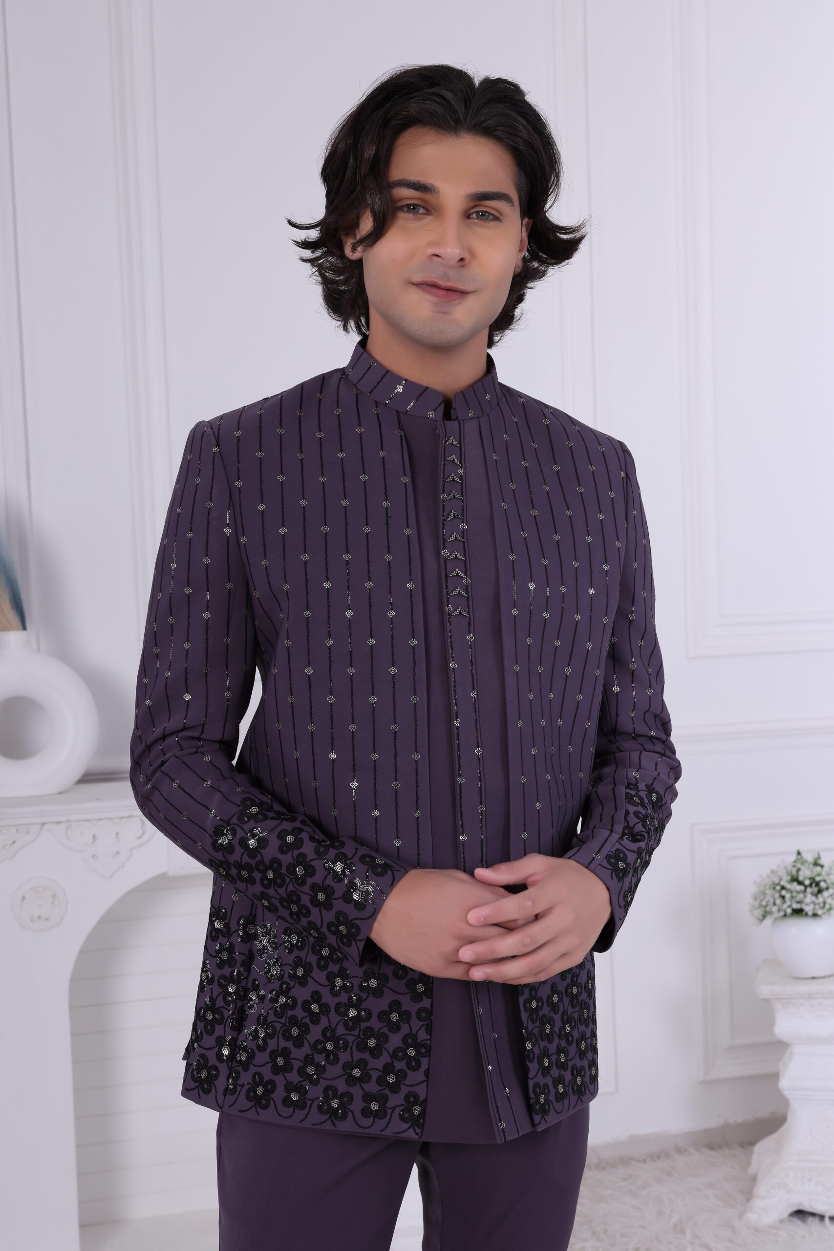 Elegant deep purple Jodhpuri suit with vertical sequin detailing and floral embroidery at the hem and sleeves, perfect for festive occasions and weddings.