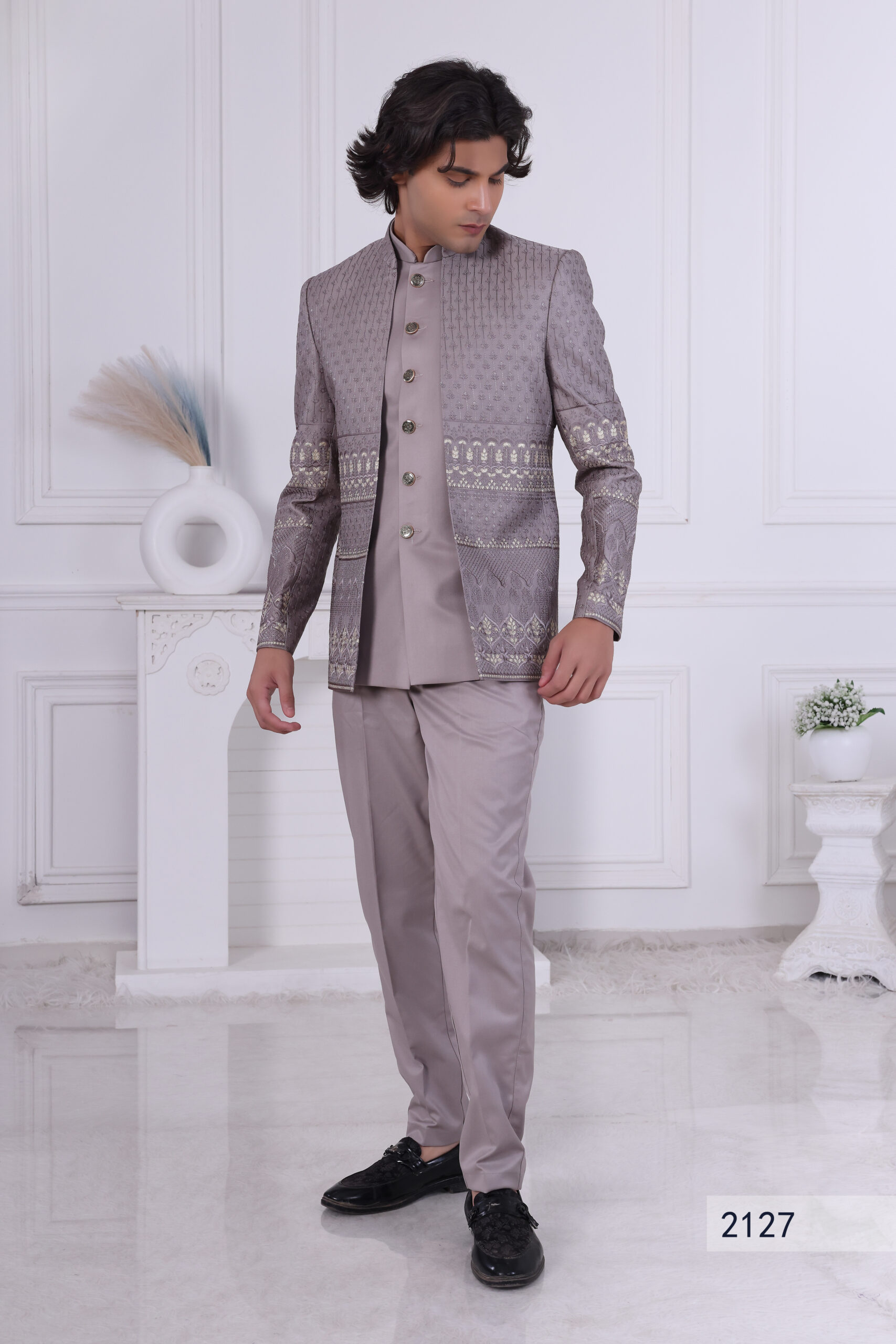 Elegant grey Jodhpuri suit with intricate embroidery, metallic accents, and statement buttons, perfect for weddings and festive occasions.