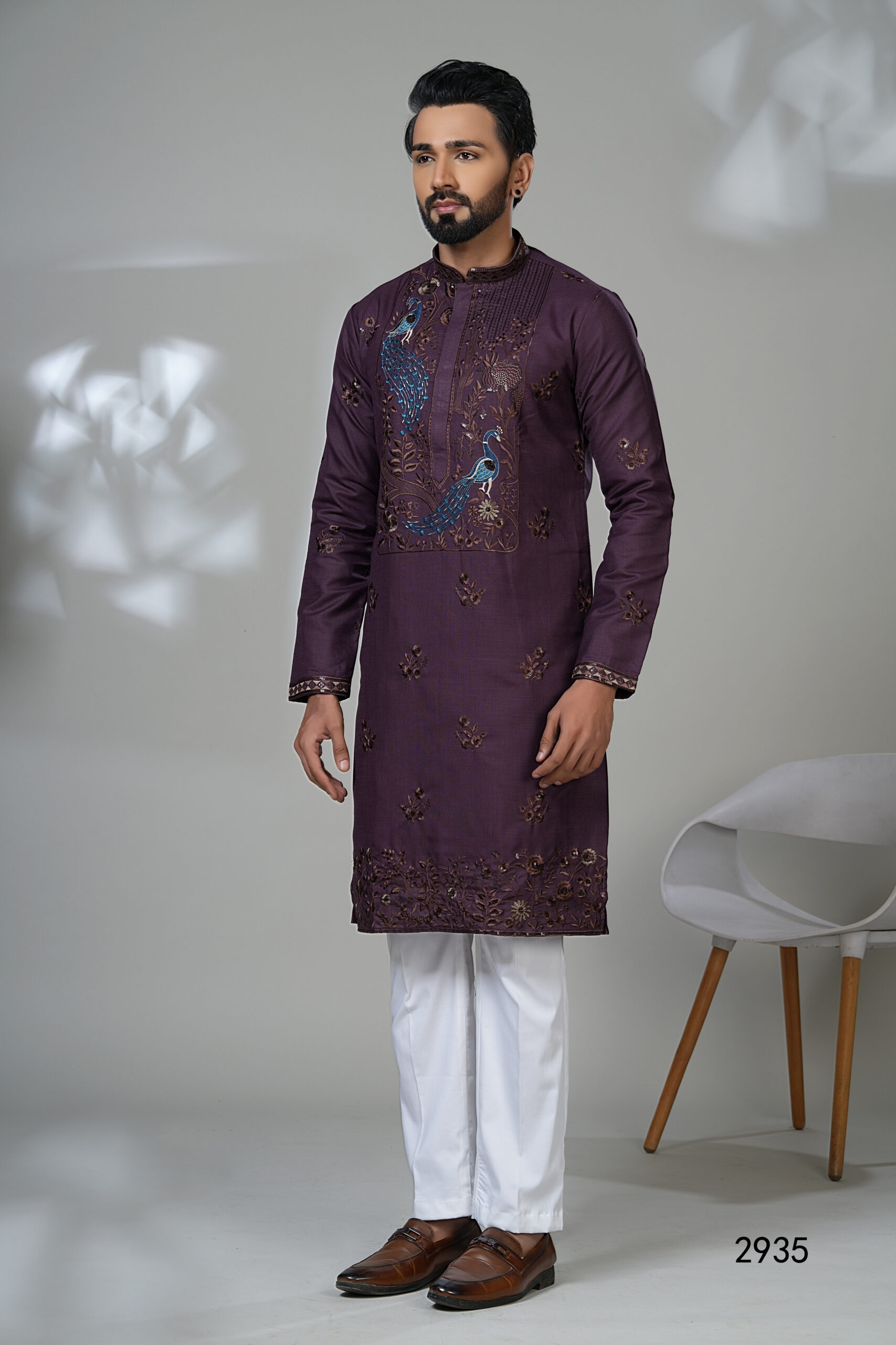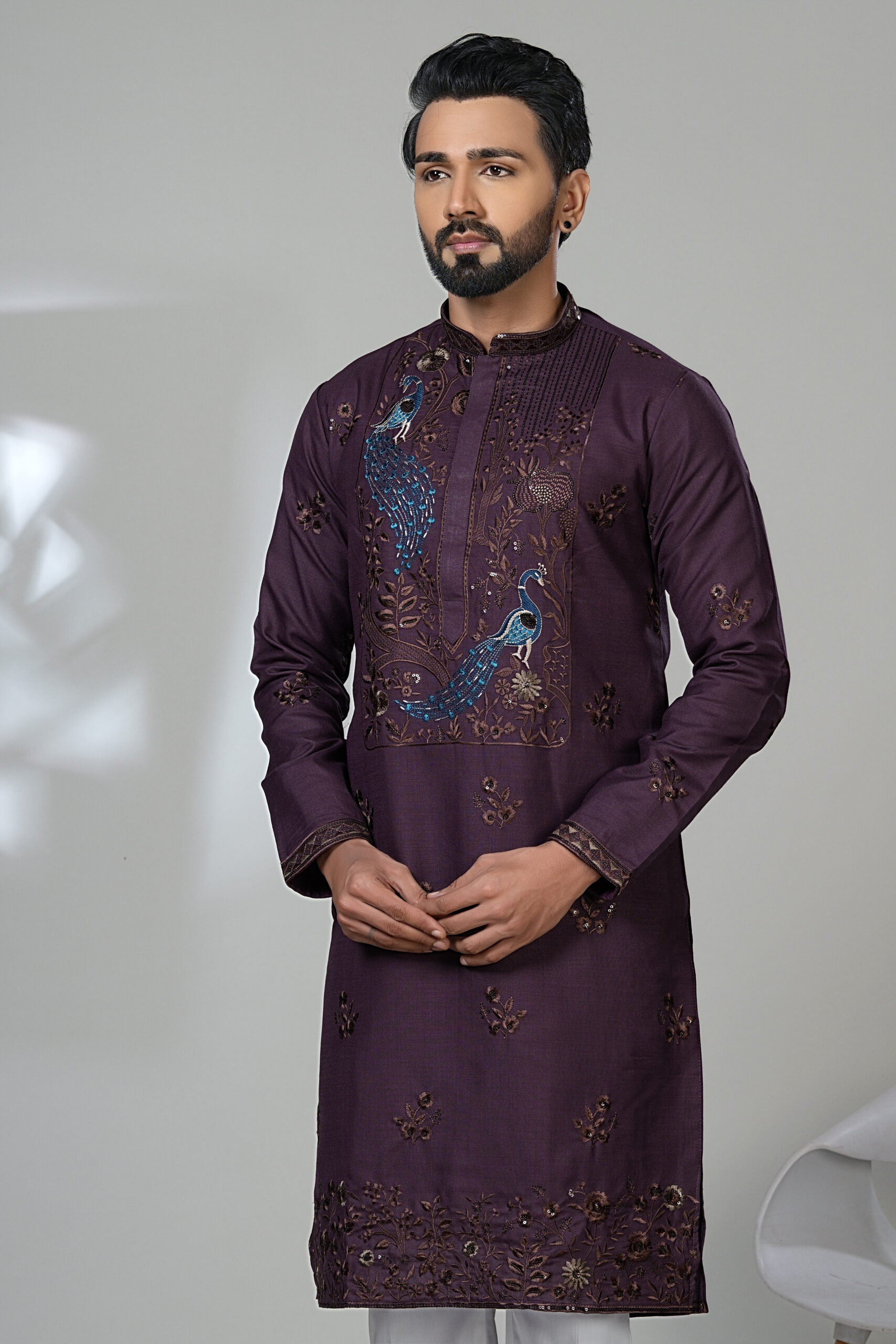 Make a bold statement with this elegant plum-colored kurta, featuring exquisite thread and sequin embroidery. Highlighted by a pair of intricately designed blue peacocks on the chest, the kurta also showcases floral embroidery throughout and along the hem. Crafted from a rich fabric with a slight sheen, this piece is perfect for festive occasions, weddings, or cultural celebrations. Paired best with white trousers or churidar and traditional loafers for a complete look.