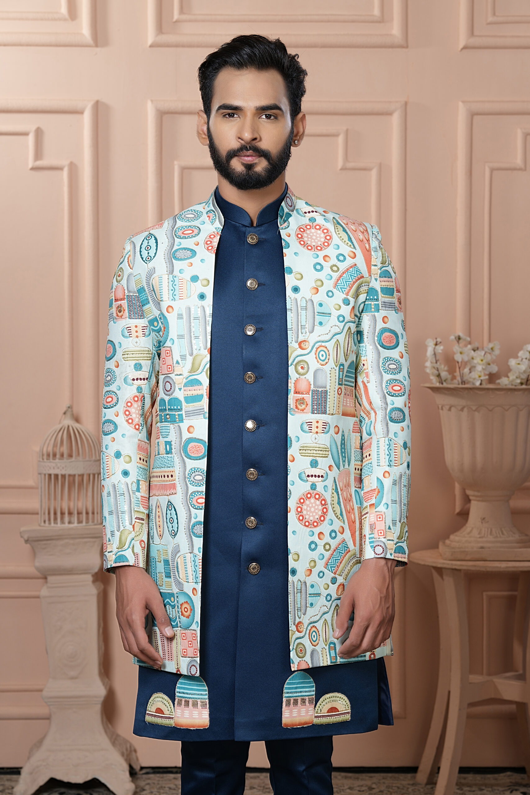 An artistic ivory Indo-Western jacket adorned with vibrant geometric and abstract motifs in shades of blue, orange, and green. Paired with a royal blue kurta and churidar, this look blends modern prints with traditional styling, making it a striking choice for festive occasions and sangeet nights.