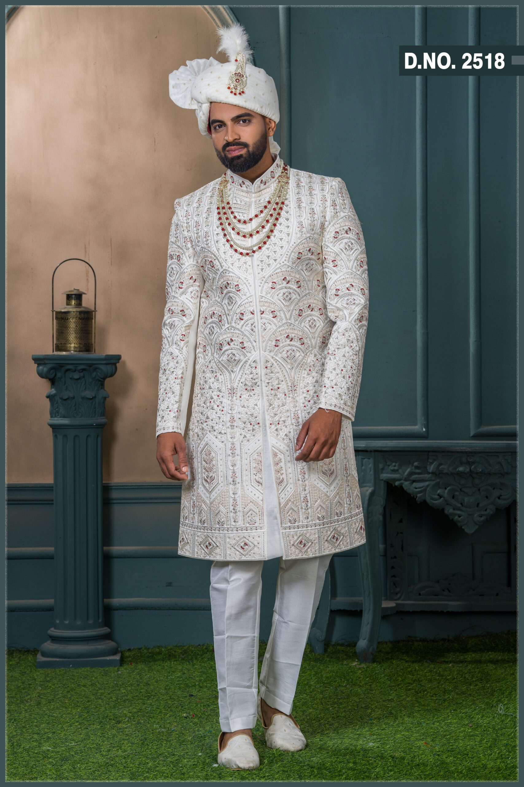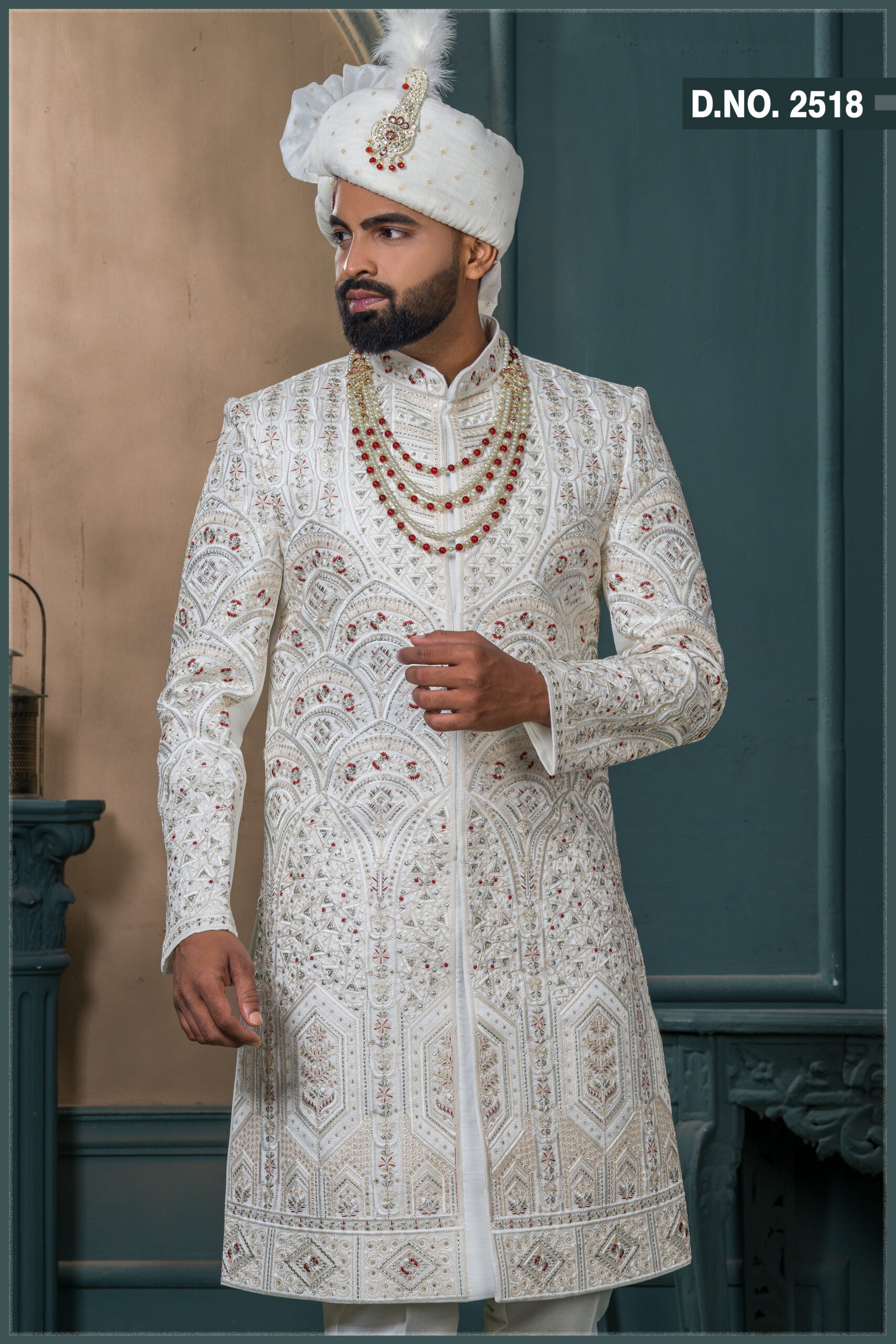 A royal ivory sherwani featuring intricate geometric embroidery patterns highlighted with delicate red and gold threadwork. The rich craftsmanship creates a layered 3D texture, blending traditional artistry with a modern silhouette. Accented with red stones and zari detailing, this sherwani perfectly complements regal wedding attire. The structured neckline and refined finish make it ideal for grooms who seek timeless elegance with a touch of grandeur.