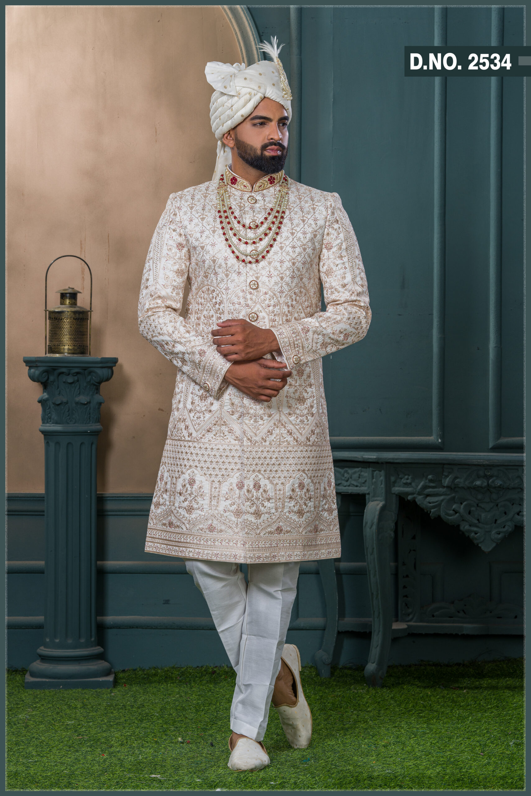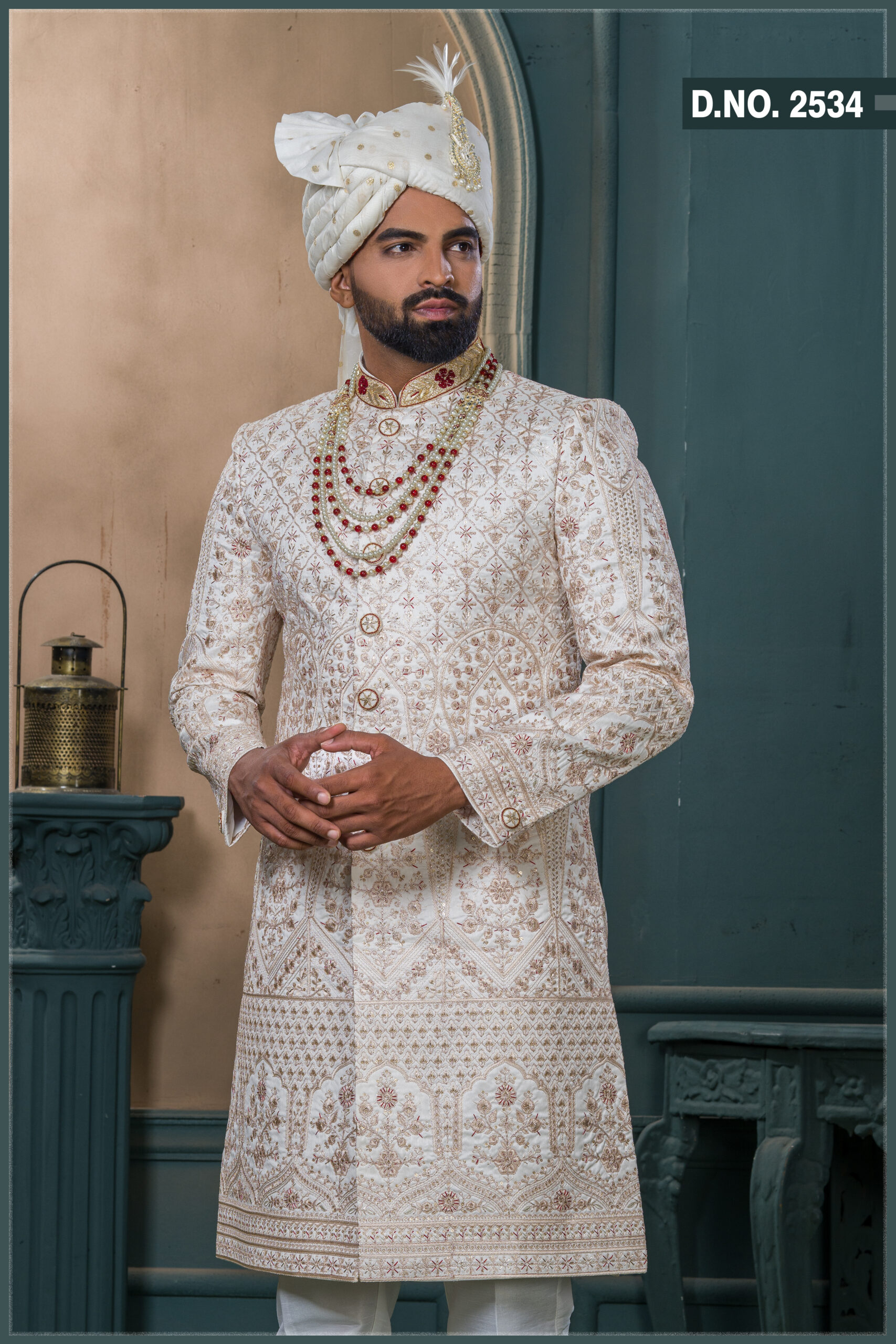 This royal ivory gold sherwani showcases intricate hand embroidery featuring floral and geometric patterns that exude elegance and grandeur. The subtle golden threadwork is beautifully contrasted with ruby-red detailing along the collar and buttons, creating a statement of timeless sophistication. Perfect for grooms who appreciate a fusion of classic craftsmanship and modern luxury, this piece pairs gracefully with a pearl-and-ruby layered mala and an ivory turban adorned with feather embellishment.