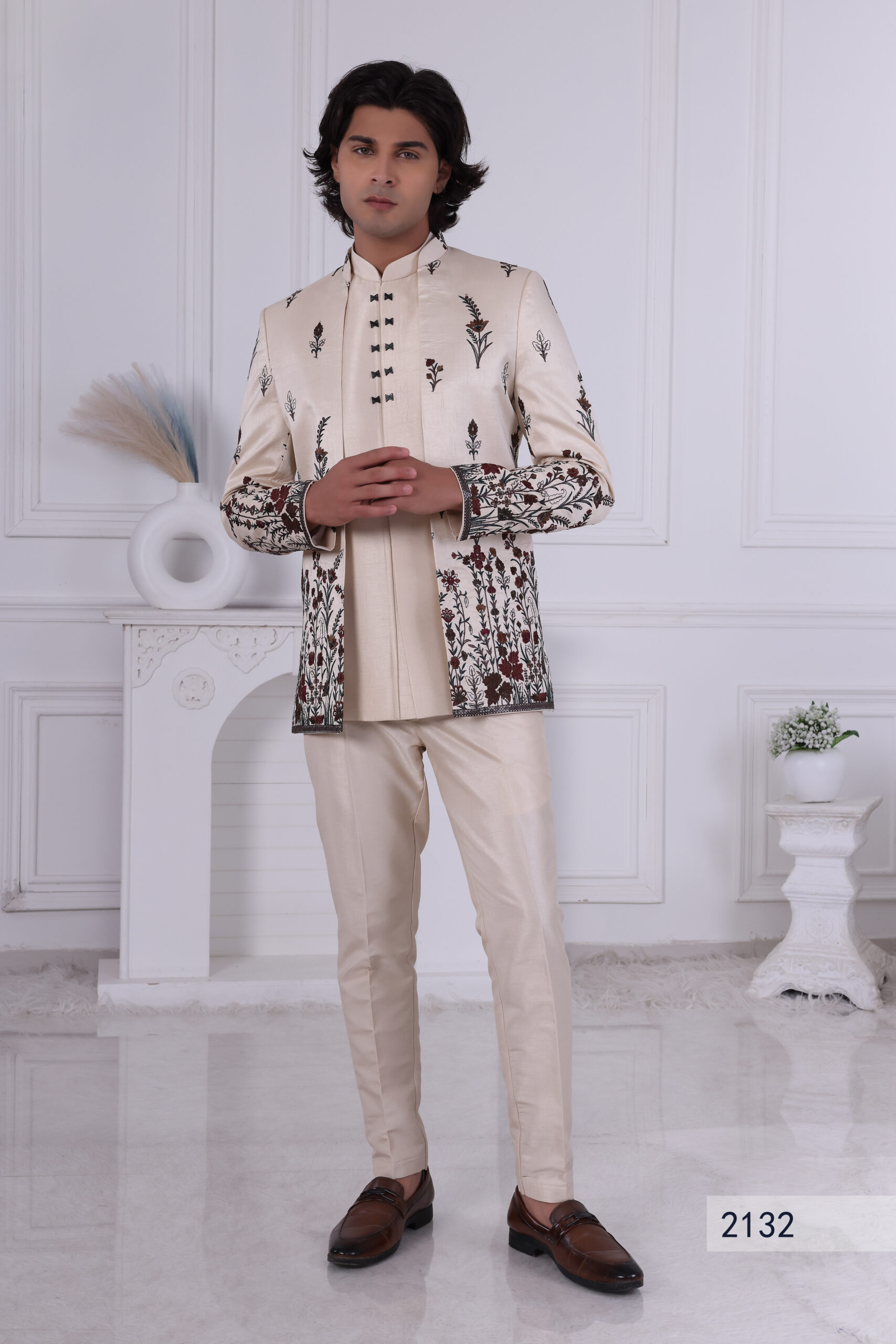 A graceful ivory Jodhpuri suit adorned with elegant floral embroidery in deep maroon and black. The minimalist yet detailed design adds charm and sophistication, making it a perfect choice for engagements, receptions, and festive occasions.