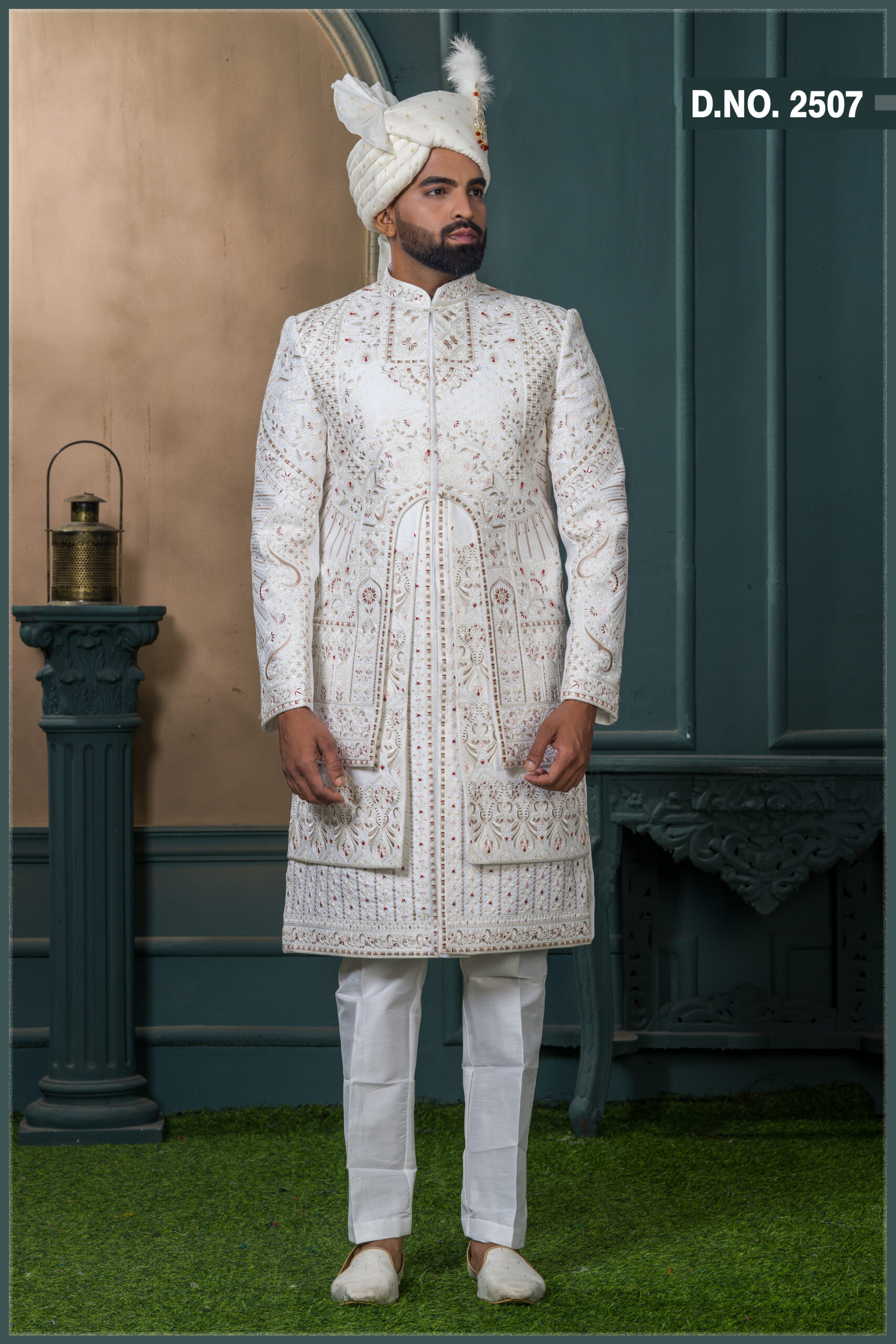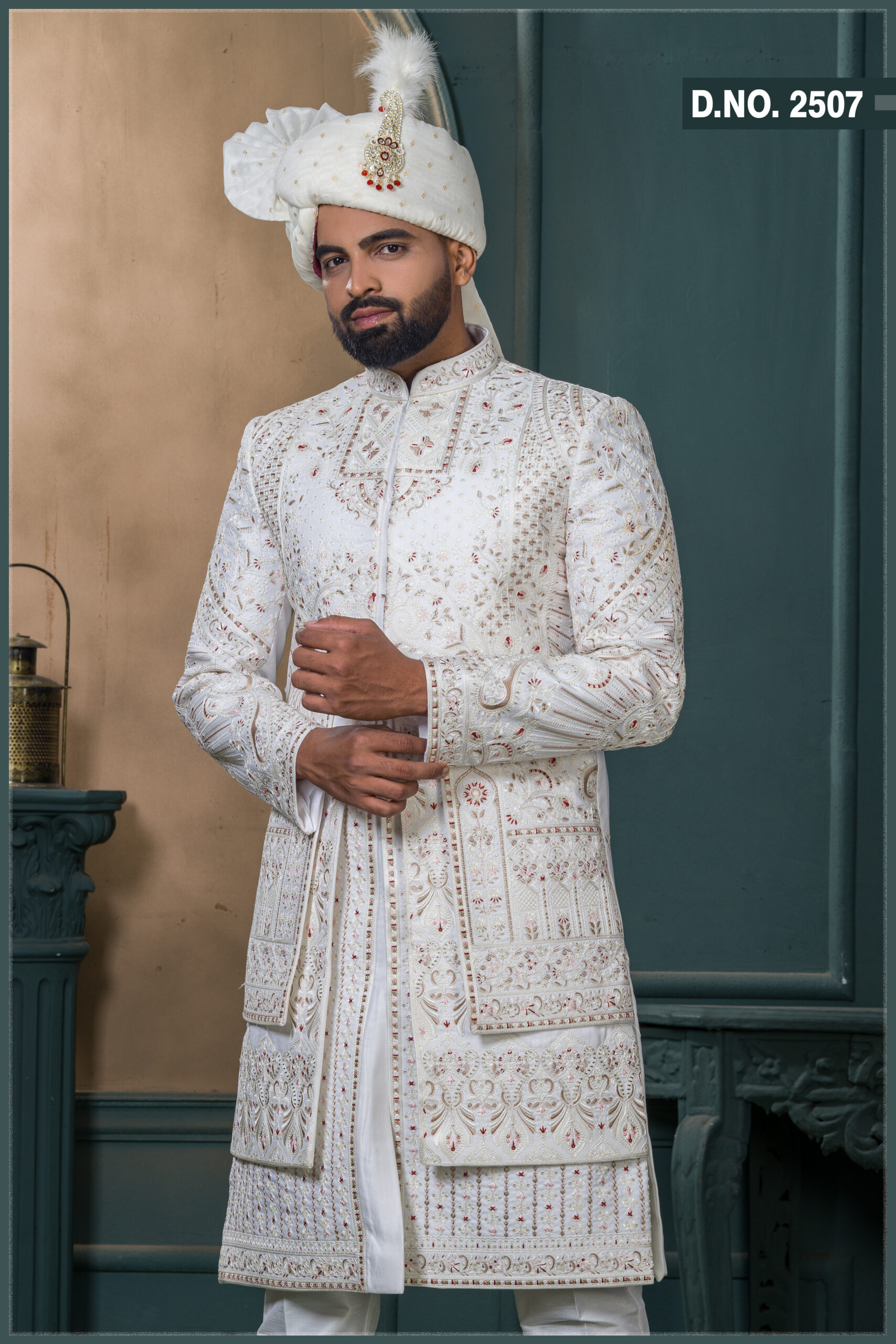 This ivory sherwani, crafted in premium malai silk, features intricate red thread and golden zari embroidery across a finely detailed pattern. The subtle contrast of red highlights adds depth to the royal ivory base, giving it a regal and festive appeal. Ideal for grooms seeking a luxurious and sophisticated look for wedding ceremonies.