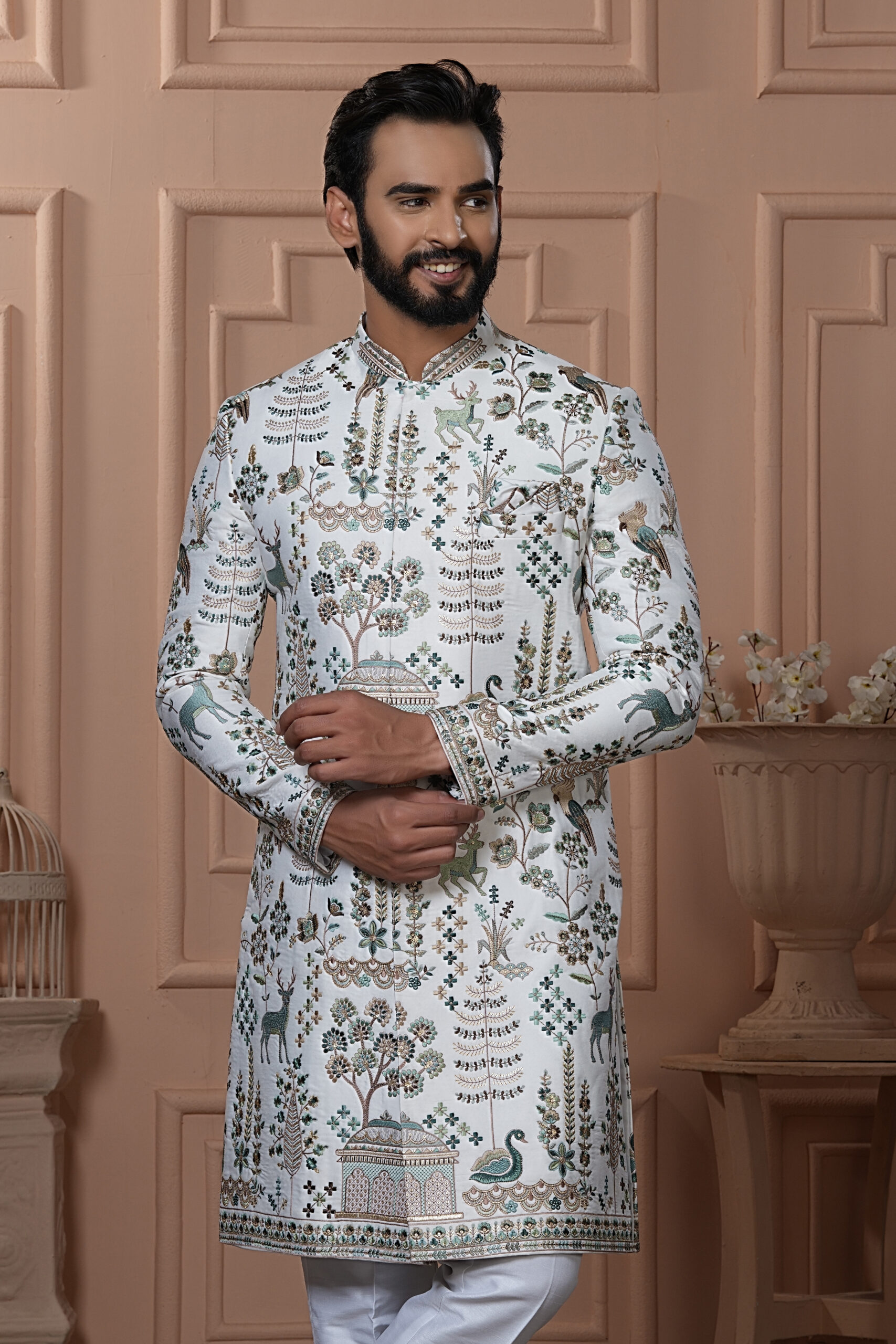 A refined ivory Navabi adorned with intricate nature-inspired motifs, including trees, deer, birds, and architectural elements. The design beautifully captures a regal yet artistic vibe, blending heritage prints with modern tailoring. Paired with white bottoms, this sherwani is ideal for weddings, festive occasions, and royal-themed celebrations.