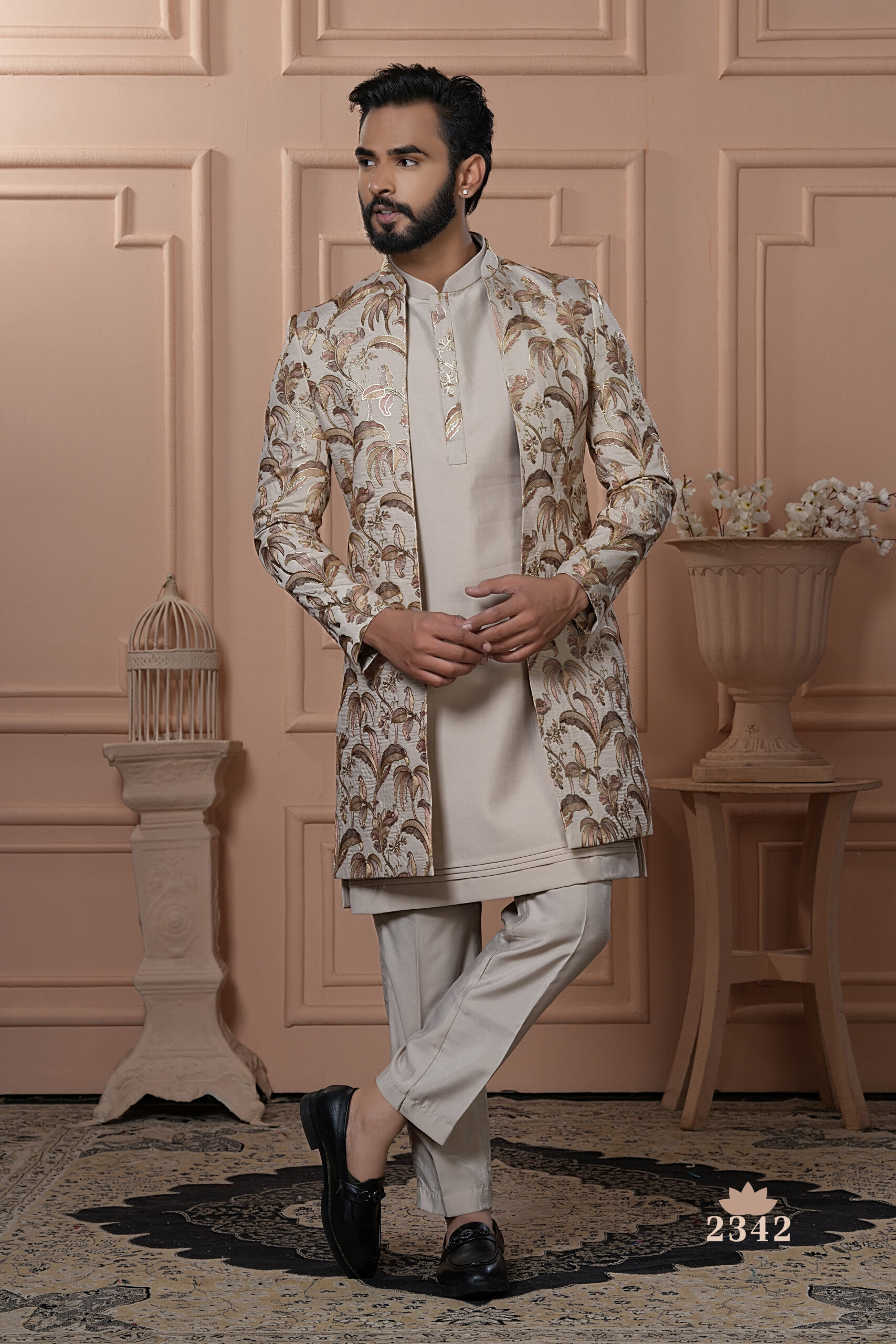 Exude subtle elegance with this ivory Indo-Western outfit, featuring a richly embroidered palm leaf design in golden and beige tones. Ideal for daytime weddings and festive celebrations.