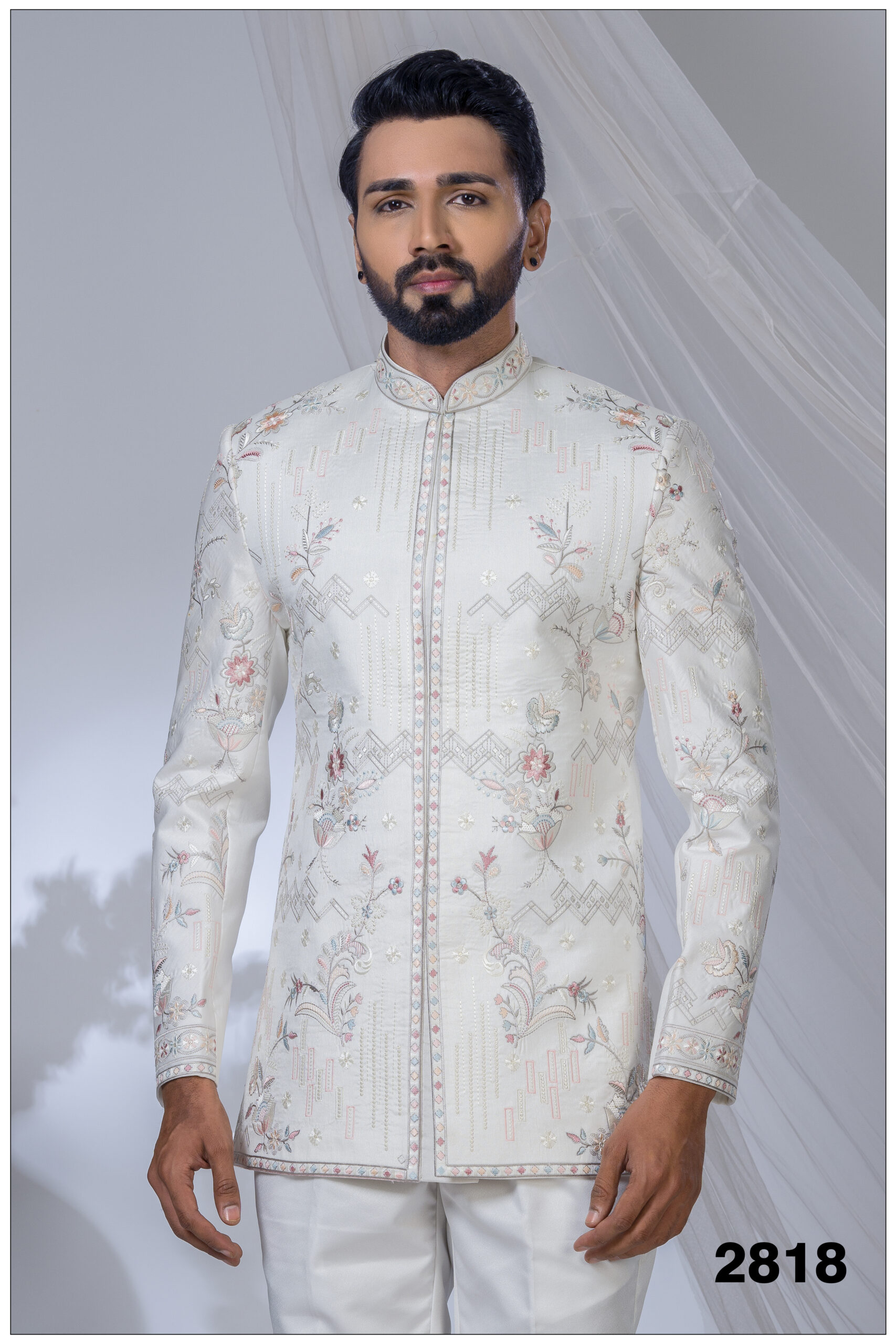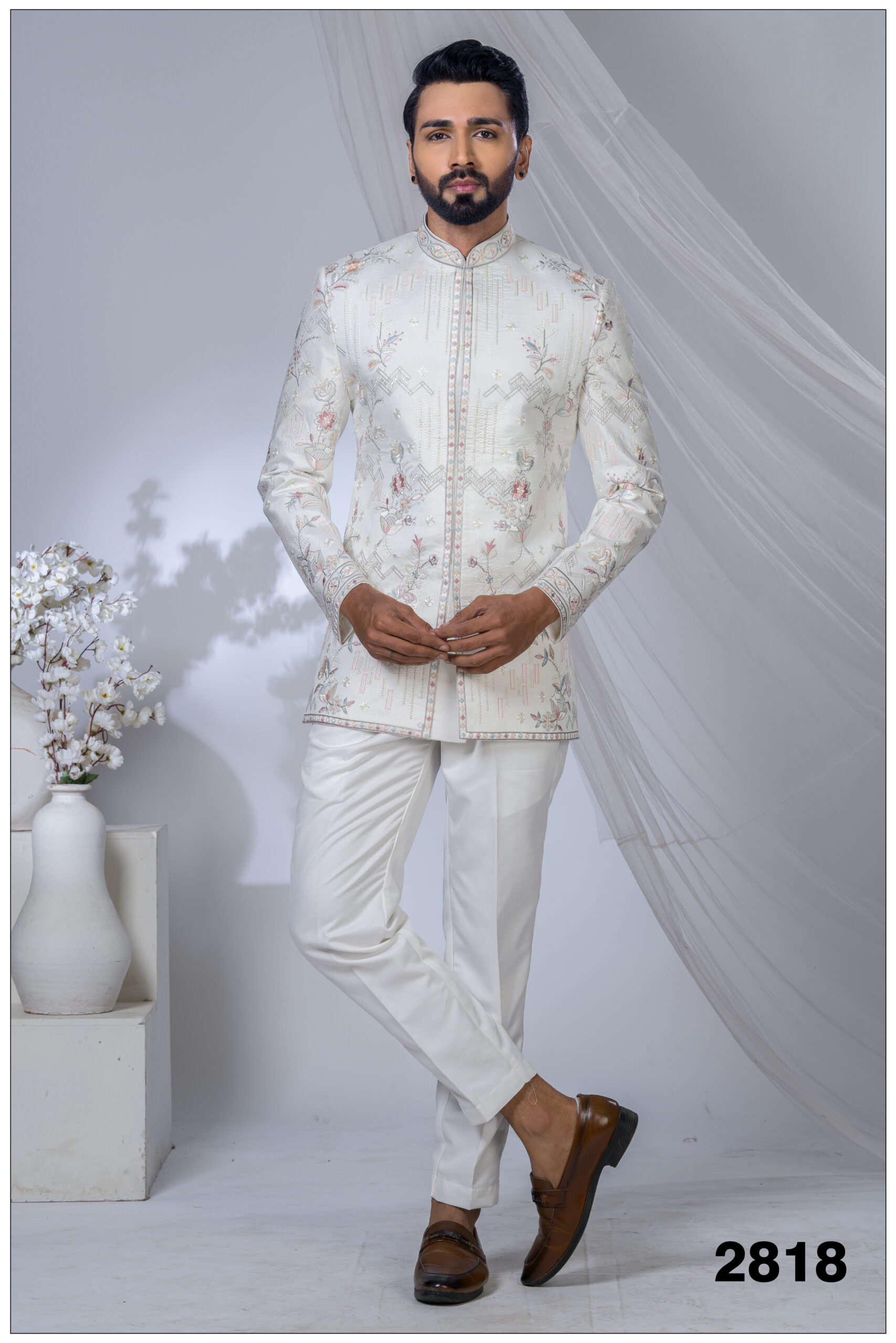 A refined ivory Jodhpuri suit adorned with delicate pastel-toned floral and geometric embroidery. The mandarin collar and streamlined front closure enhance its graceful silhouette, while the subtle color palette adds elegance and sophistication. Perfect for weddings, engagements, and festive occasions, this piece captures timeless royal charm with a modern touch.