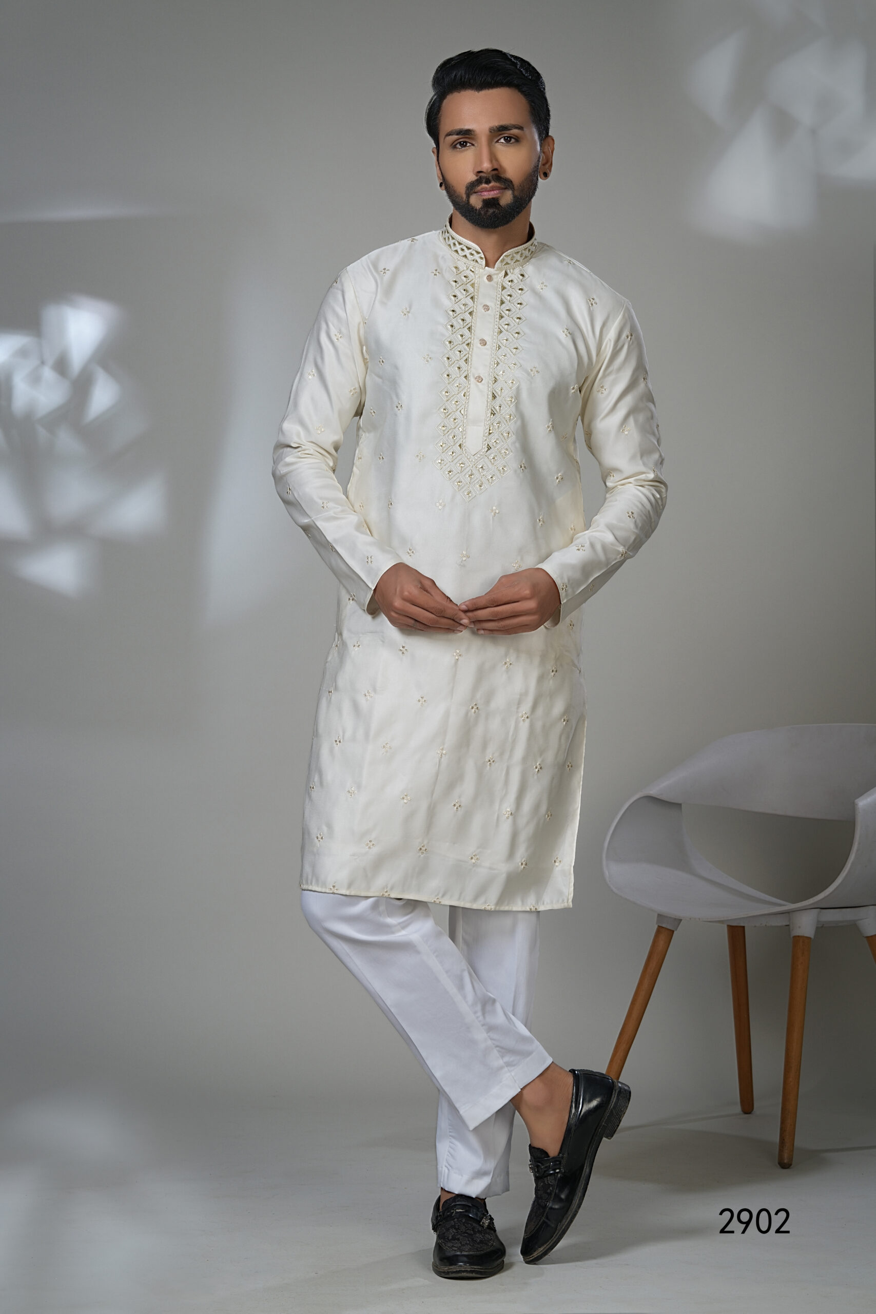 Elegance meets tradition in this Ivory Pearl Embroidered Kurta, perfect for any formal or festive occasion. Crafted from a soft ivory-toned fabric, this kurta features intricate pearl-like embroidery across the front panel and scattered florals all over. The detailed placket and minimalistic design create a timeless and graceful look. Ideal for groomsmen, engagements, or Eid gatherings, it pairs best with white pants and traditional footwear for a polished ethnic ensemble.