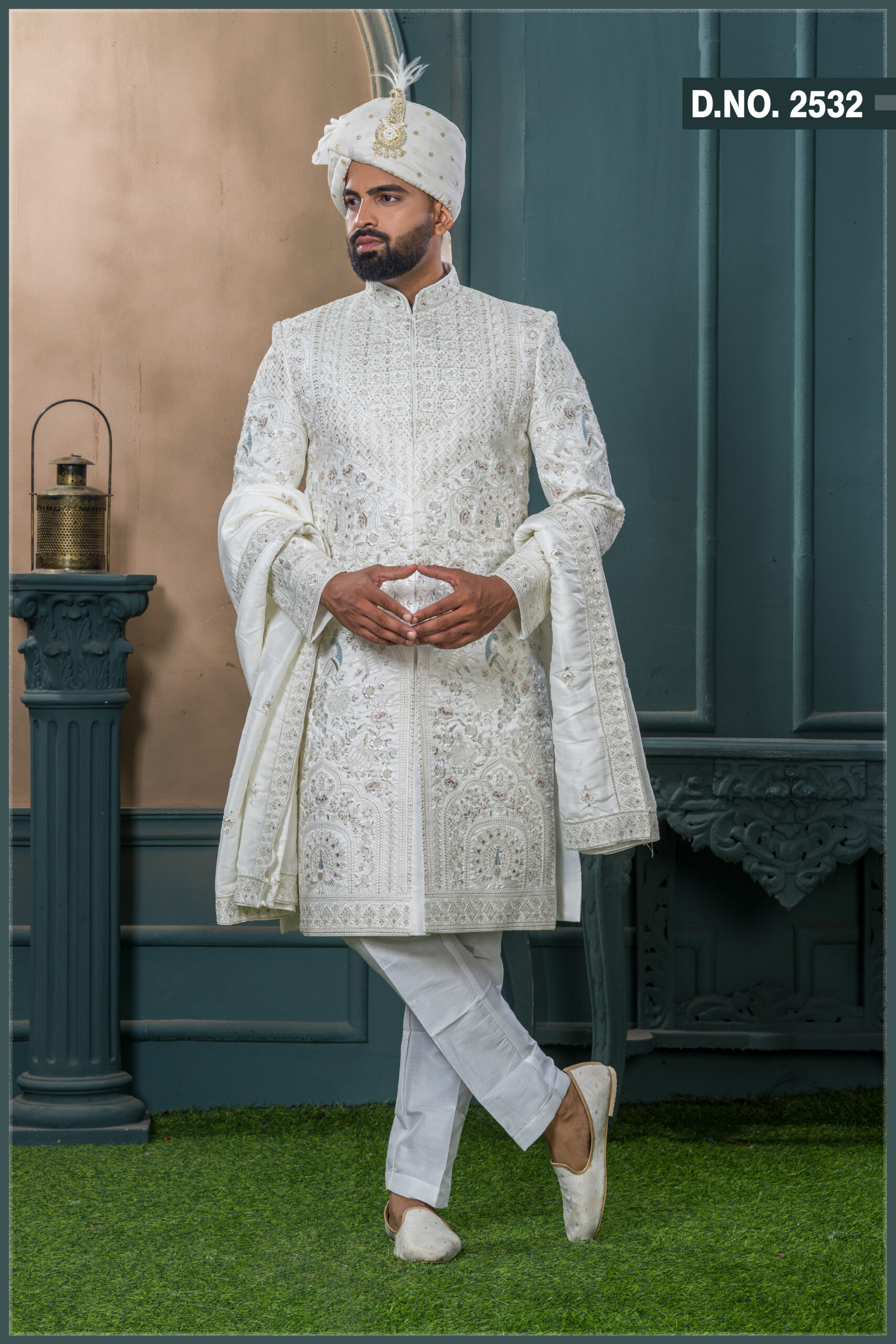This exquisite ivory sherwani is adorned with intricate silver threadwork, enhanced by delicate hints of blue that add a touch of modern grace. The detailed peacock and floral motifs symbolize grandeur and prosperity, making it an ideal choice for a groom seeking understated luxury. Crafted from premium fabric with precision hand embroidery, it offers both elegance and comfort for wedding and festive occasions.