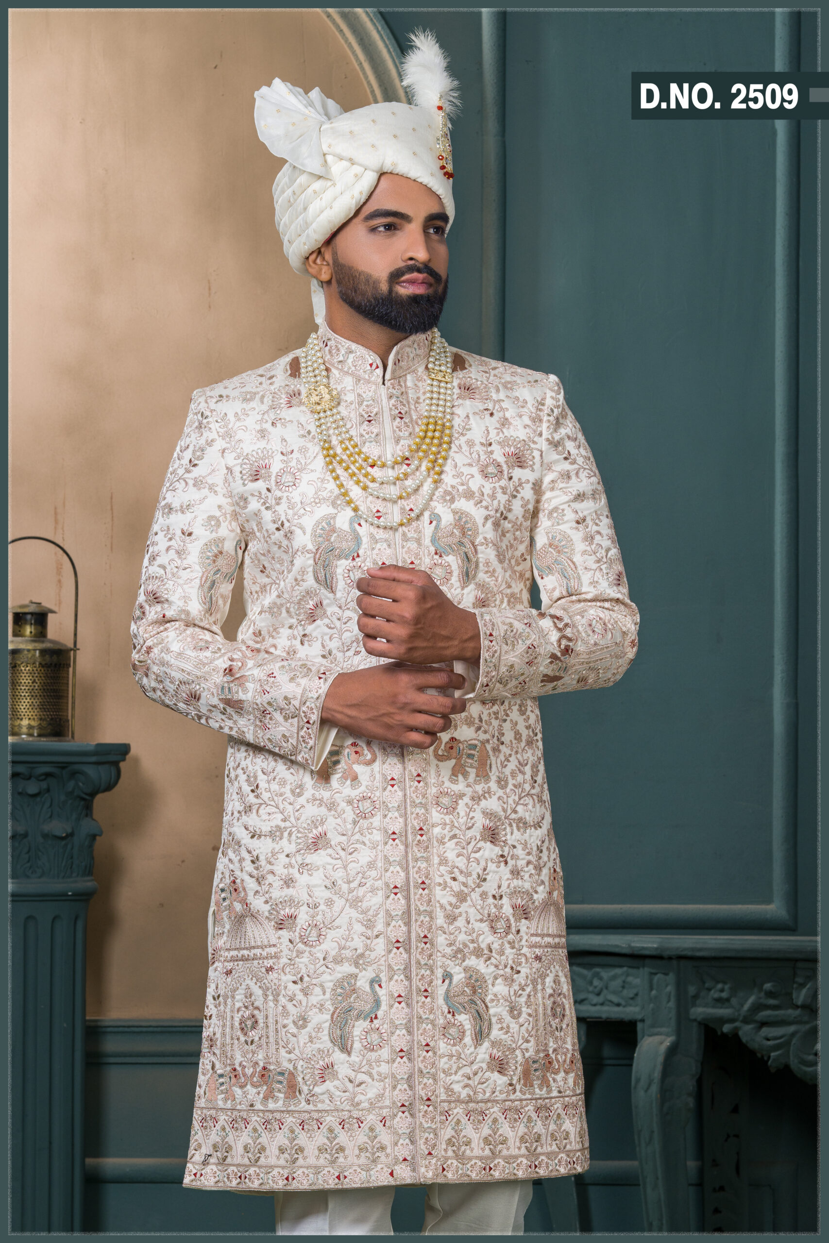 Ivory Silk Sherwani with Royal Peacock and Elephant Zari Embroidery