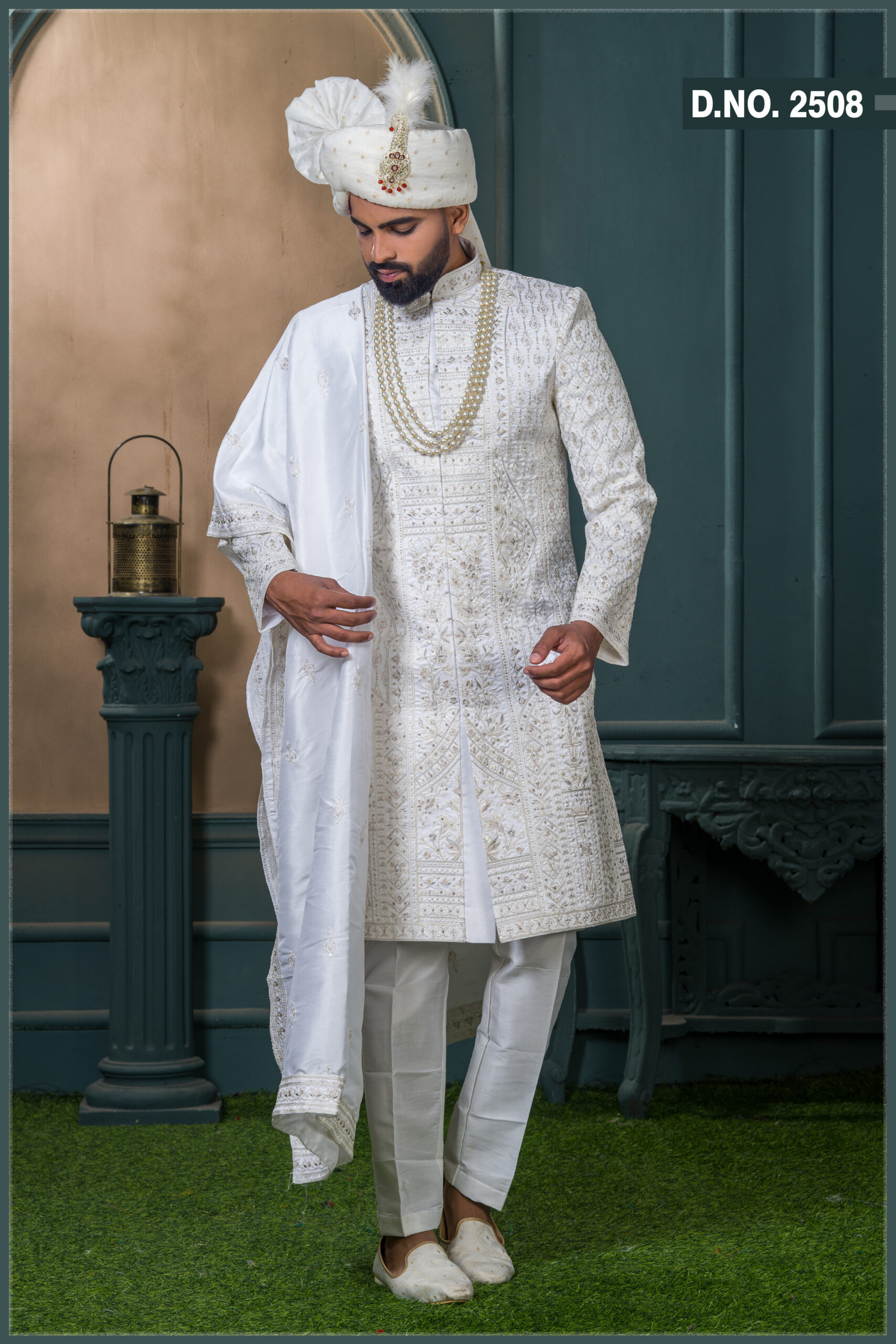 A timeless ivory silk sherwani featuring exquisite self-tone zari and sequin embroidery that radiates royal sophistication. The intricate detailing across the front and sleeves adds a touch of understated luxury, perfect for grooms seeking a refined and graceful wedding look.