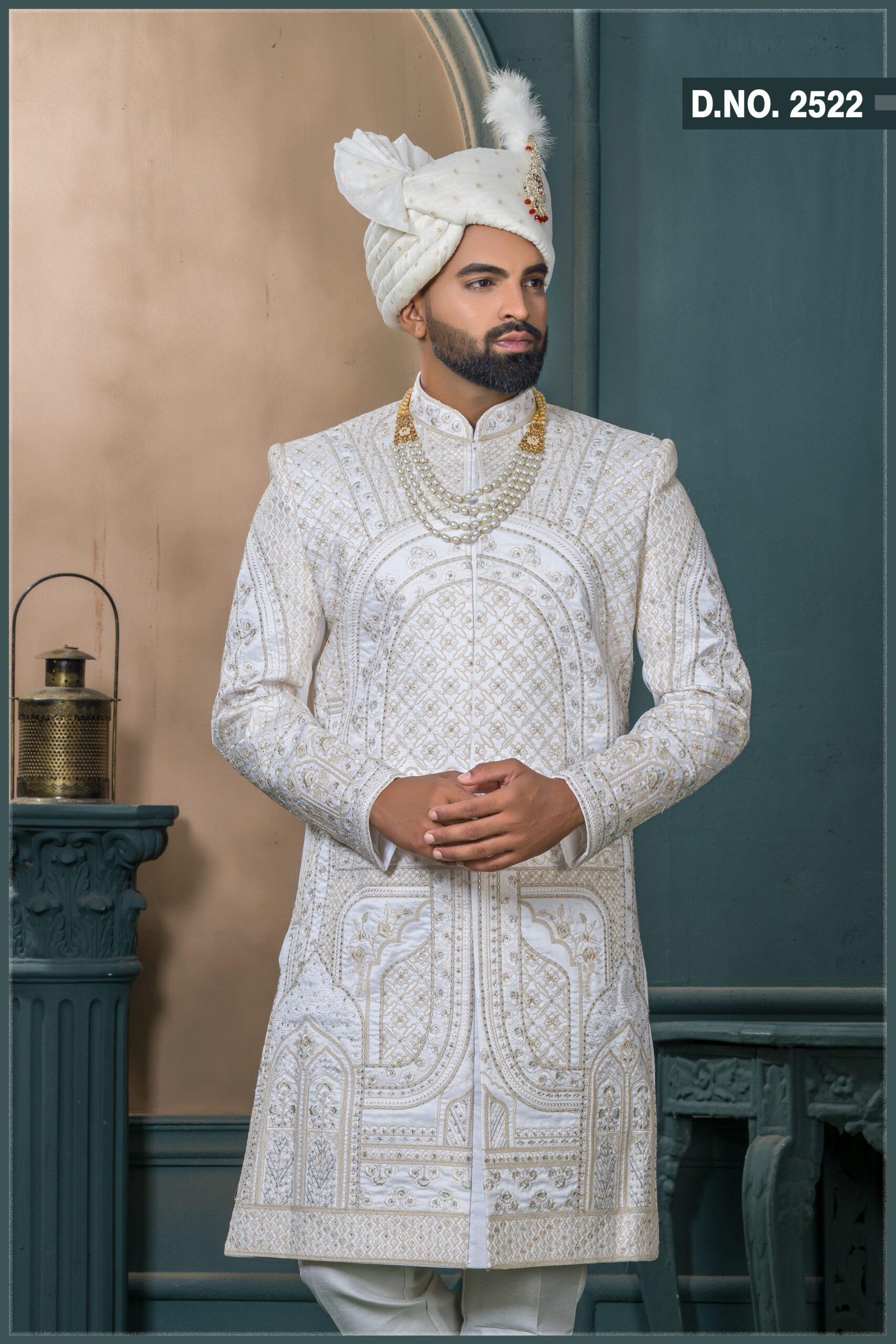 This elegant ivory sherwani captures the essence of traditional craftsmanship blended with modern royal aesthetics. The garment features intricate geometric patterns and arched embroidery panels, creating a regal yet refined texture. Each motif is hand-detailed with tonal threadwork in champagne gold and ivory hues, offering a luxurious shimmer under light. Perfect for wedding ceremonies or grand receptions, this sherwani elevates any groom’s look with timeless sophistication and royal poise.