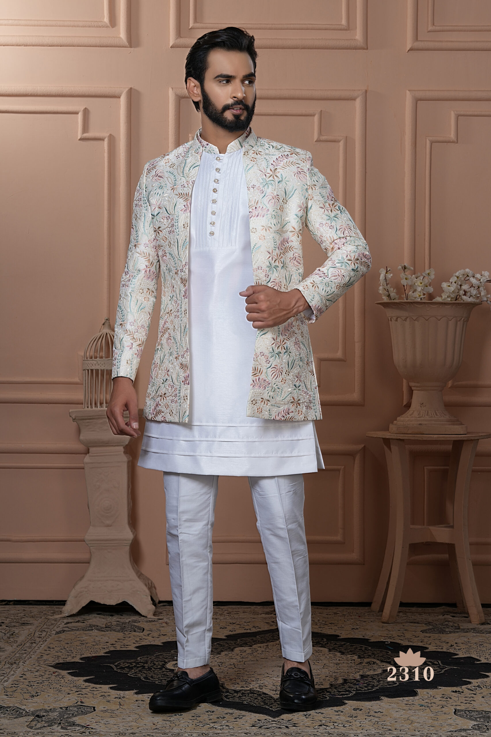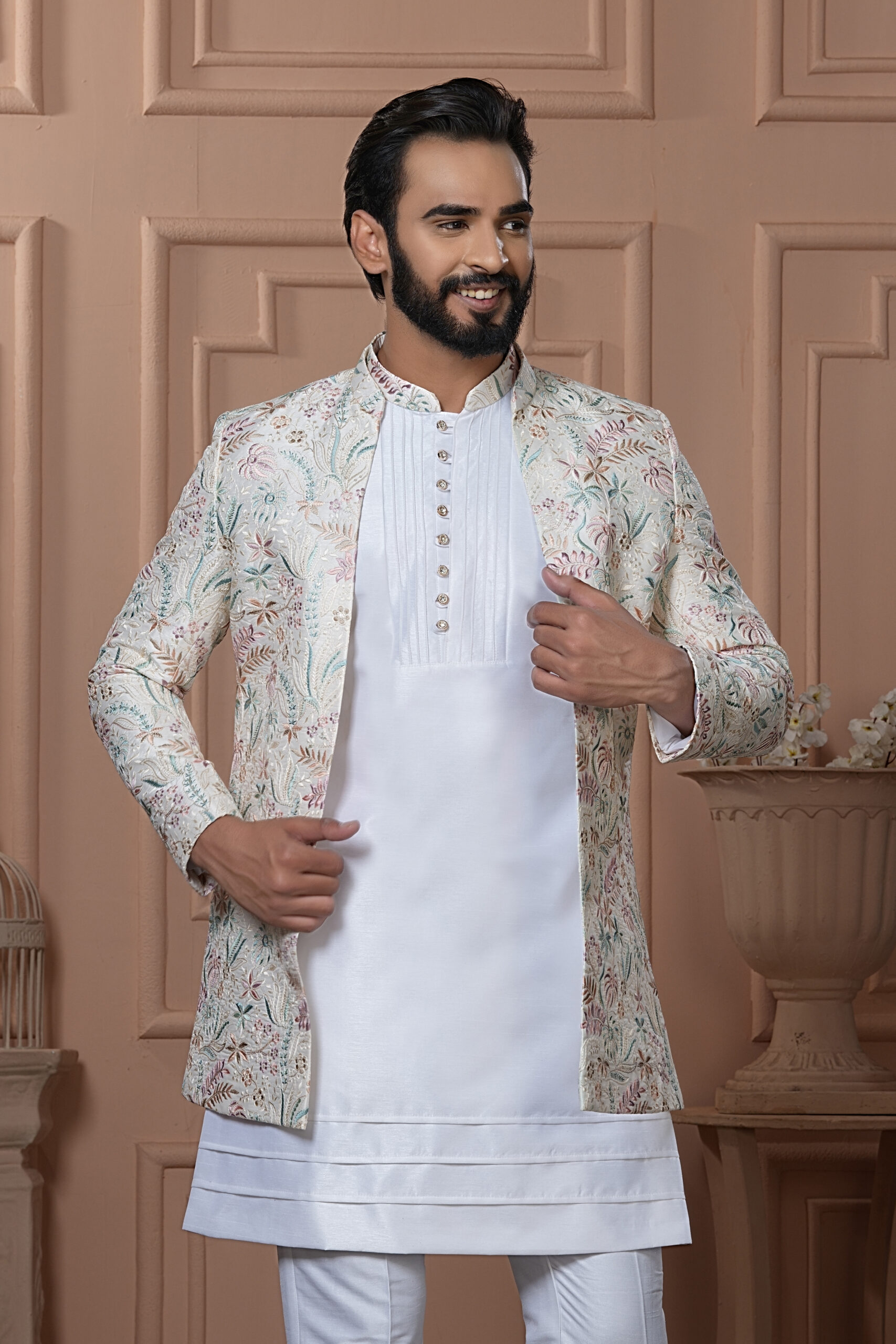 A sophisticated ivory white Indo-Western set featuring a mandarin-collared kurta paired with a pastel-toned embroidered jacket. The floral patterns in soft hues of peach, aqua, and gold create a refreshing yet regal look. Ideal for engagement ceremonies, festive occasions, or daytime celebrations.
