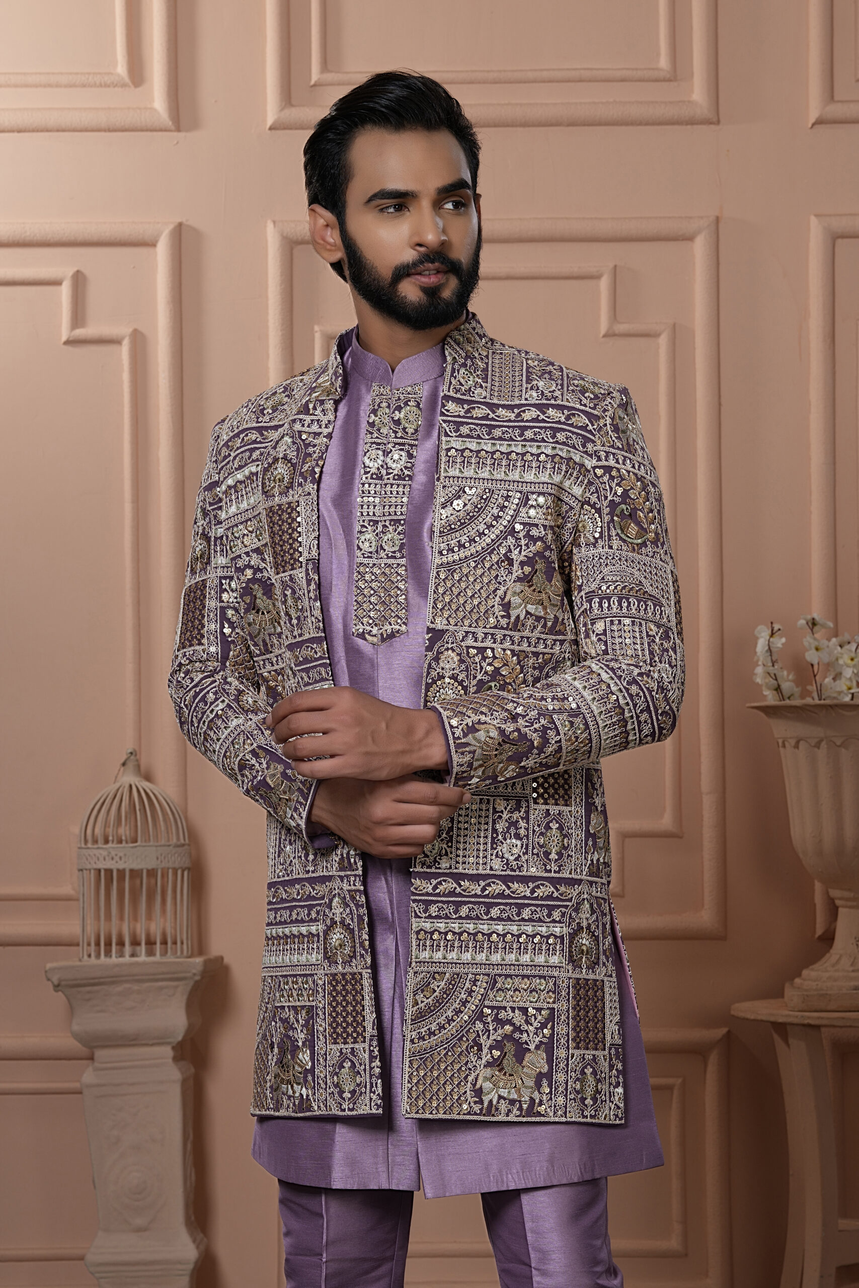 A statement Indo-Western outfit in lavender silk, paired with a finely embroidered long jacket. The jacket features intricate thread and zari detailing with regal motifs, adding a luxurious touch to the contemporary silhouette. Perfect for weddings, receptions, and festive occasions, this attire blends tradition with modern sophistication.