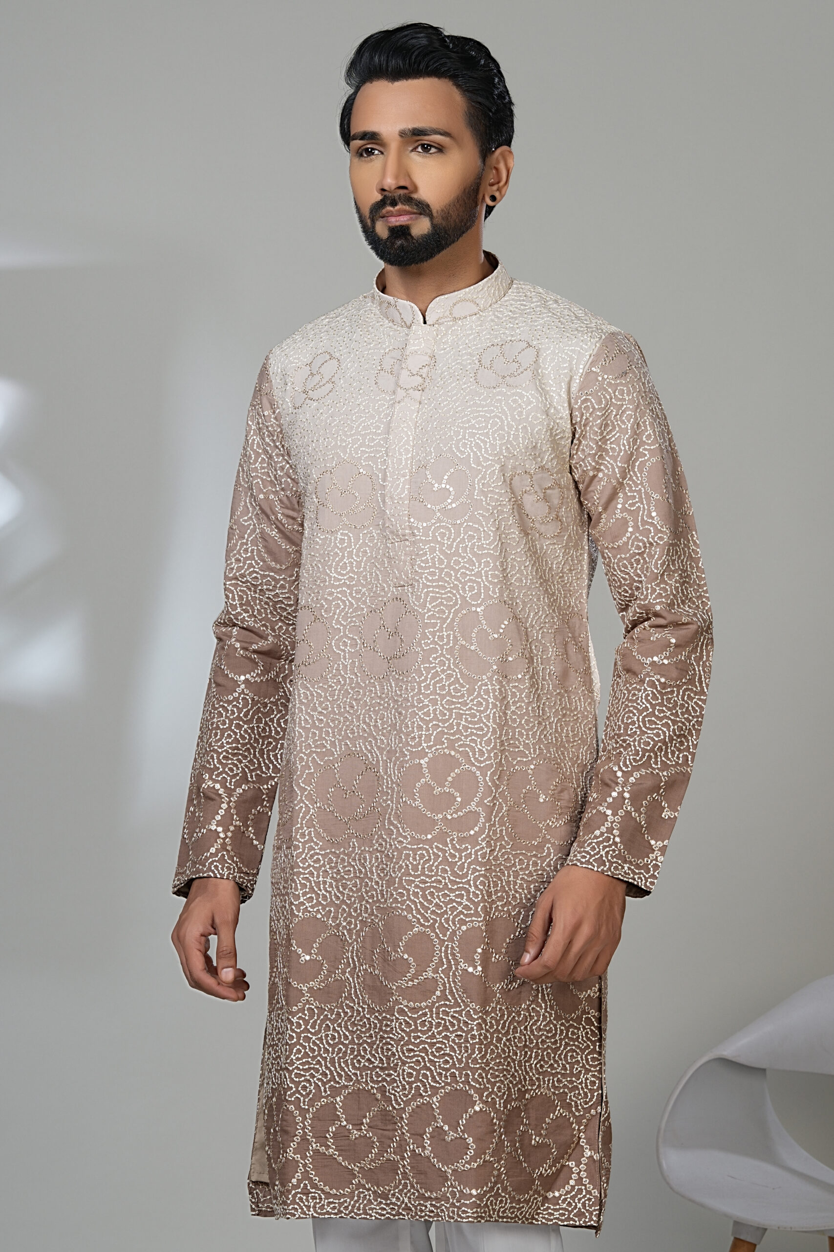 Elevate your traditional wardrobe with this elegant beige and brown kurta set, featuring intricate embroidery and a refined gradient design. The kurta showcases a high-quality fabric with detailed floral and swirl patterns that gracefully blend from light beige at the top to a rich brown at the hem. Paired with crisp white trousers and finished with black formal shoes, this ensemble is perfect for festive occasions, weddings, or cultural celebrations. The mandarin collar and button placket add a touch of sophistication, while the tailored fit ensures both style and comfort.