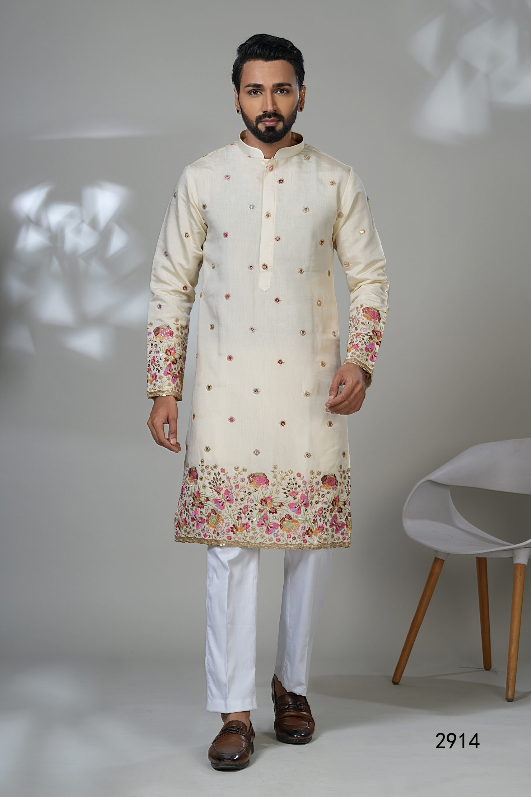 Graceful and timeless, this ivory kurta is a masterpiece of elegance and craftsmanship. Made from high-quality fabric with a soft sheen, it features delicate multicolor sequin embellishments across the front and beautifully embroidered floral patterns along the cuffs and hem in vibrant shades of pink, gold, and green. The straight cut, band collar, and concealed button placket create a polished, refined silhouette, making it perfect for wedding functions, festive occasions, and traditional gatherings.