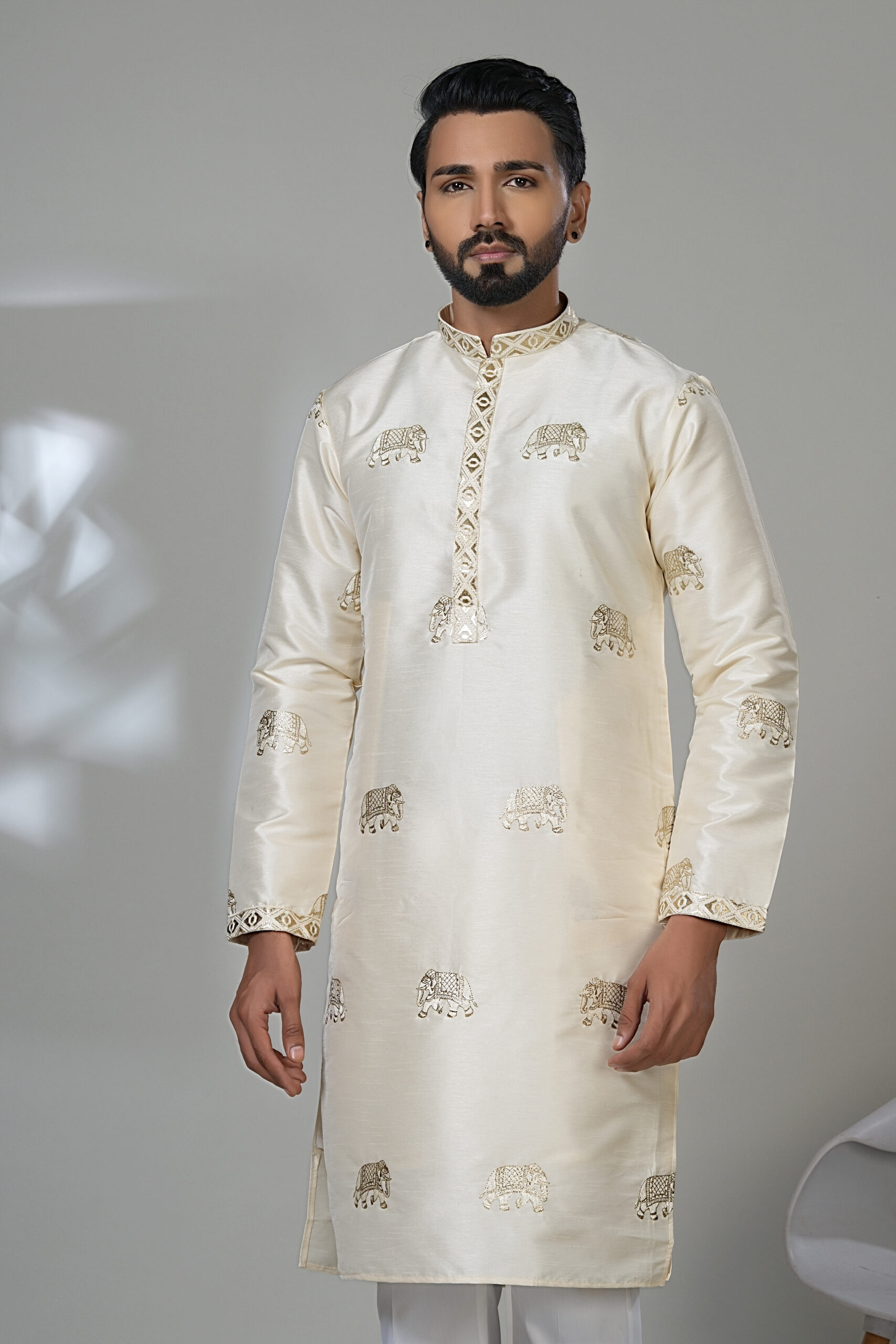 Men’s Ivory Silk Kurta with Gold Elephant Embroidery