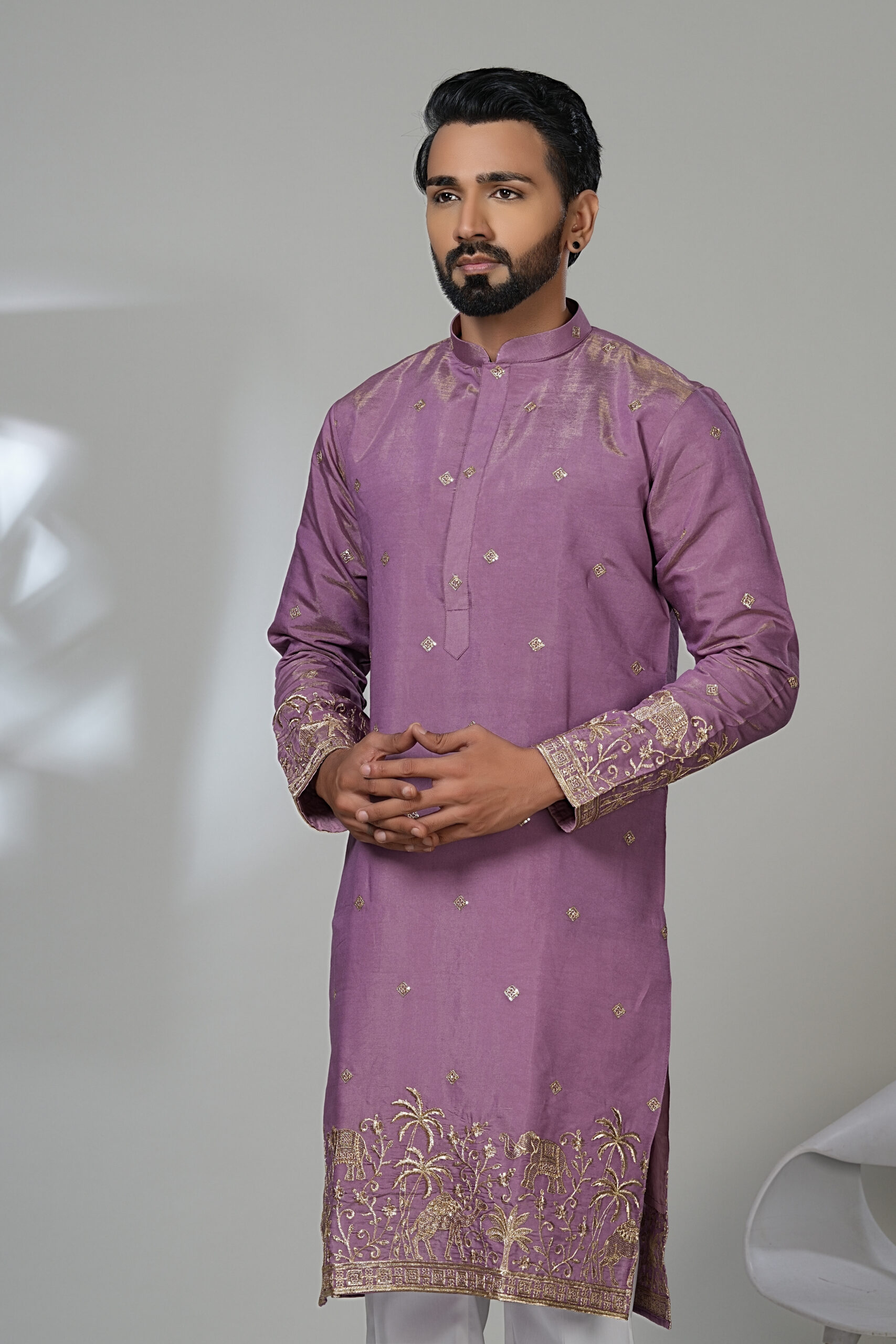 Gracefully elegant, this mauve kurta set features exquisite golden thread embroidery inspired by traditional Indian motifs, including elephants, trees, and temple borders along the hem and sleeves. The subtle shimmer of the fabric and delicate buta (motif) detailing throughout adds richness without overwhelming the design. Paired with white trousers and brown loafers, this outfit is perfect for festive occasions, poojas, and semi-formal celebrations. The mandarin collar and straight cut ensure a modern yet regal silhouette.