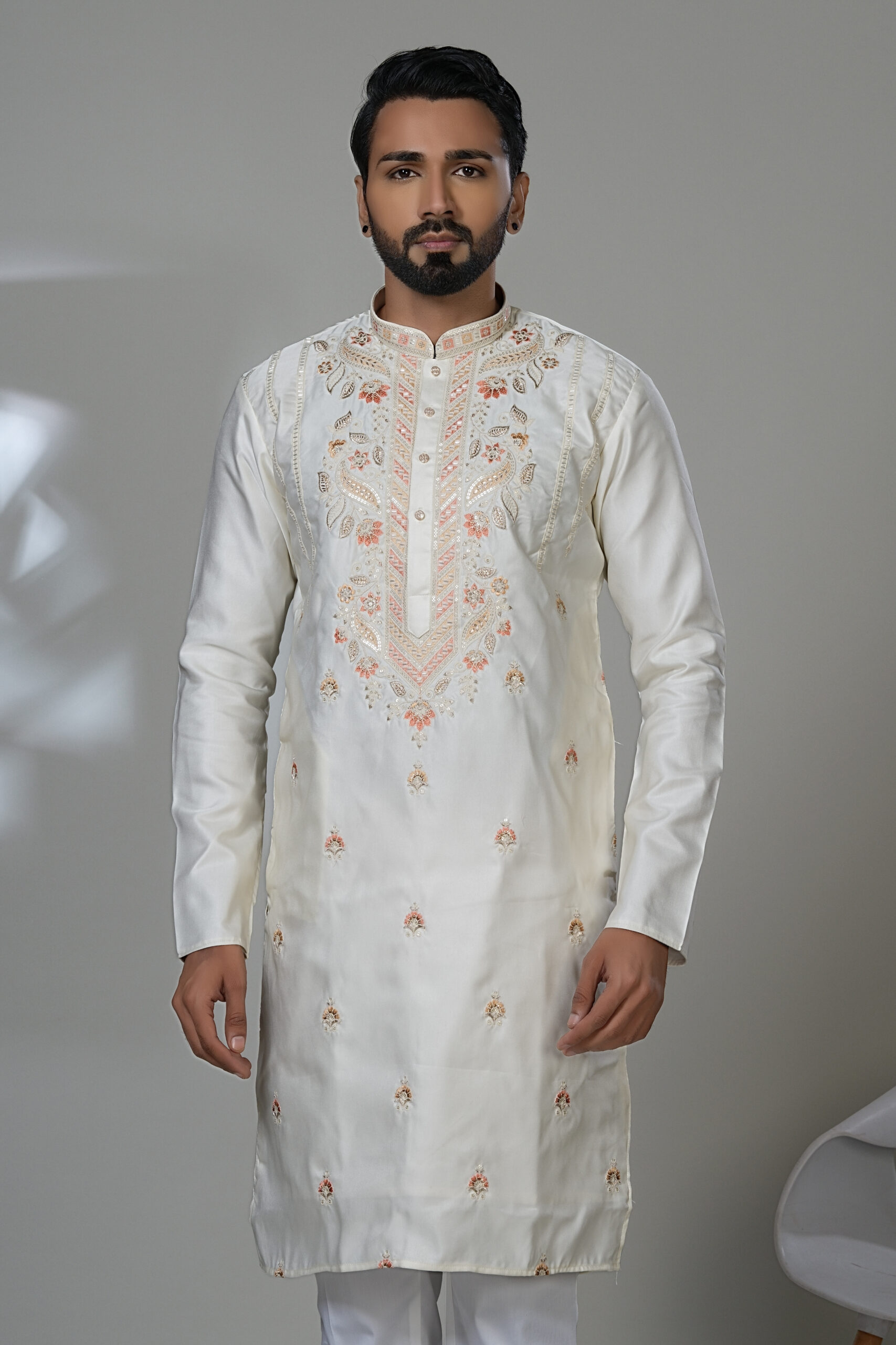 Men’s Off-White Embroidered Kurta with Subtle Peach Accents
