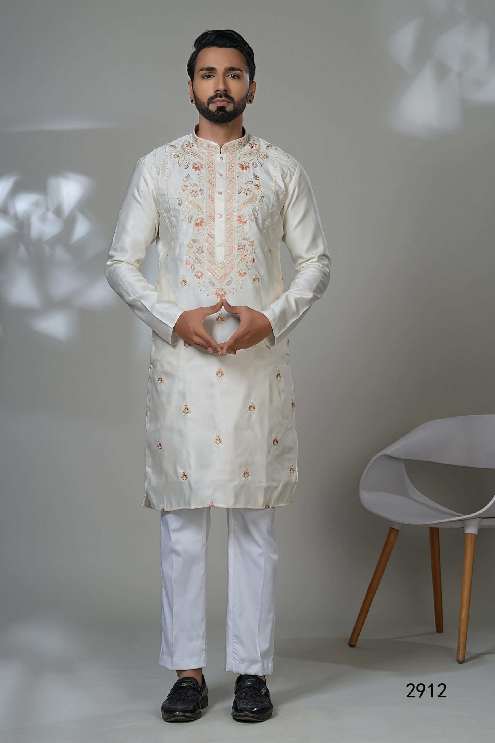 This off-white kurta embodies understated elegance and traditional charm. Tailored from a silky fabric with a natural sheen, the front panel is adorned with intricate embroidery in soft peach and ivory tones, extending from the neckline to the chest in a symmetrical pattern. Scattered floral motifs throughout the body add depth and delicacy to the design. Paired with classic white trousers, this ensemble is perfect for wedding rituals, formal festive events, or evening gatherings where a refined yet festive look is desired.