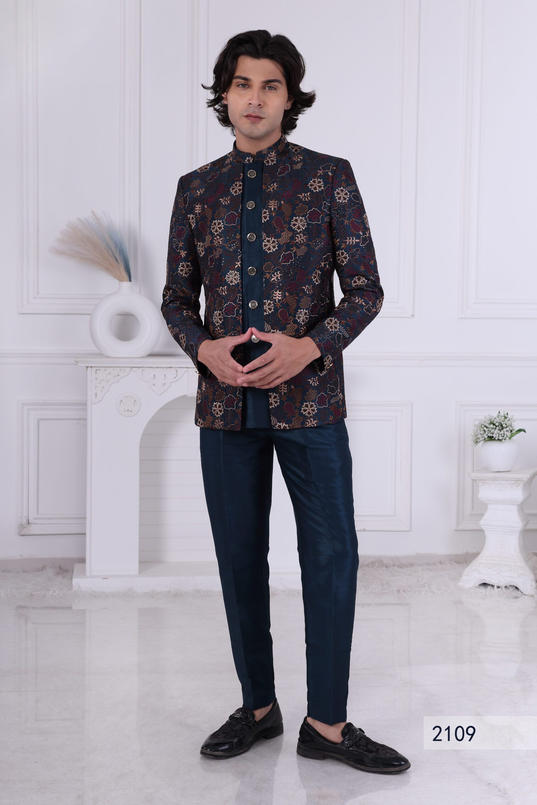 Stylish navy blue Jodhpuri suit featuring intricate multi-color floral prints with metallic buttons, perfect for weddings and festive gatherings.