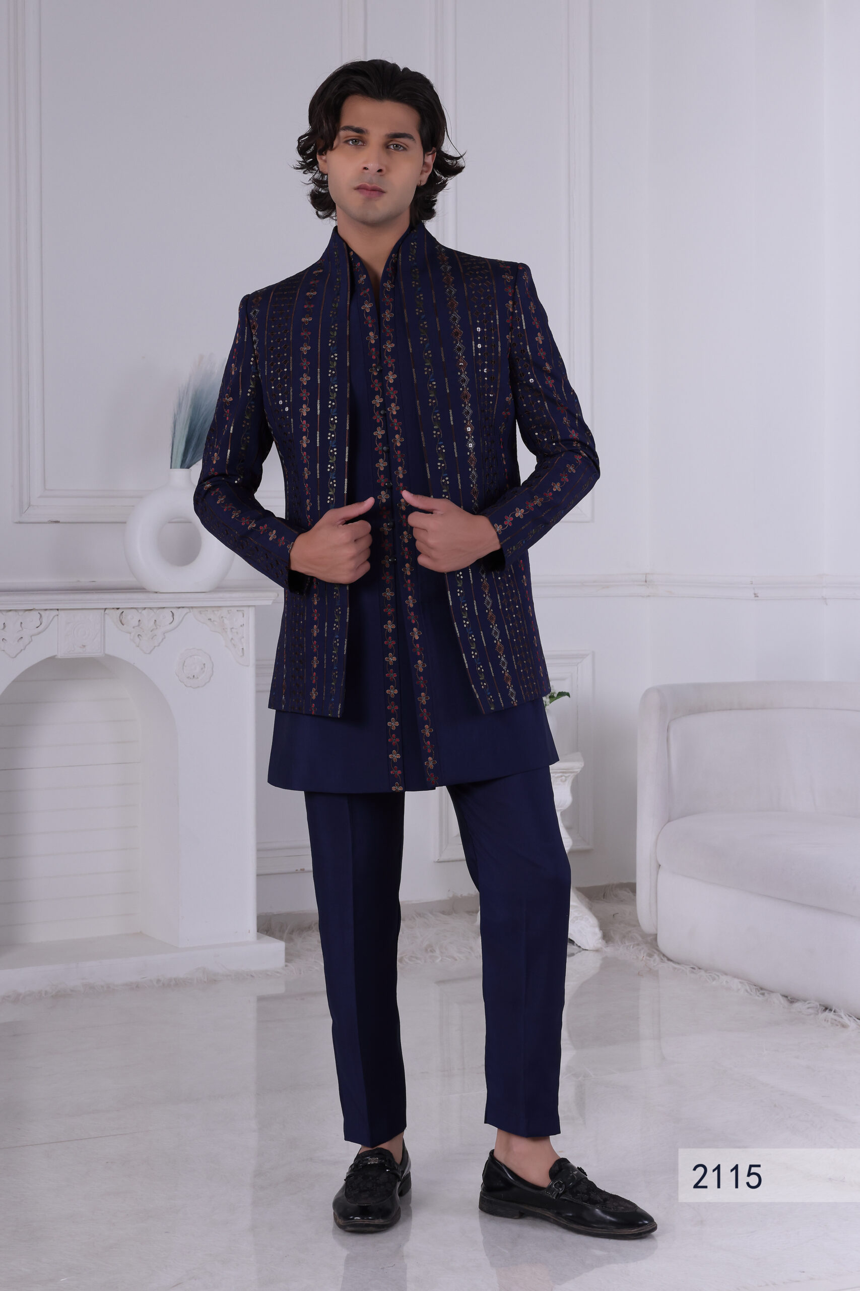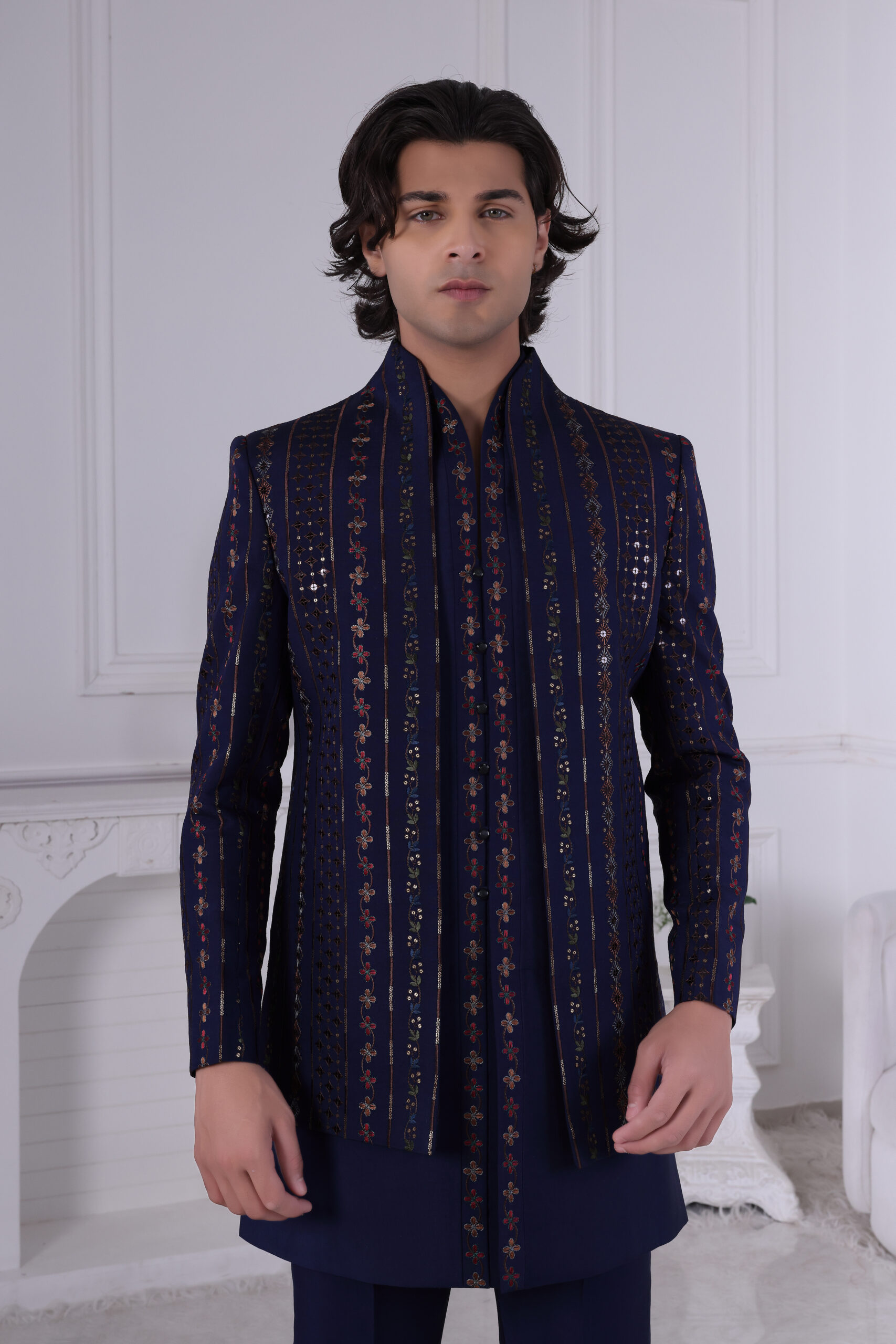 Elegant navy blue Jodhpuri suit with vertical embroidered stripes and mirror accents, perfect for weddings and festive occasions.