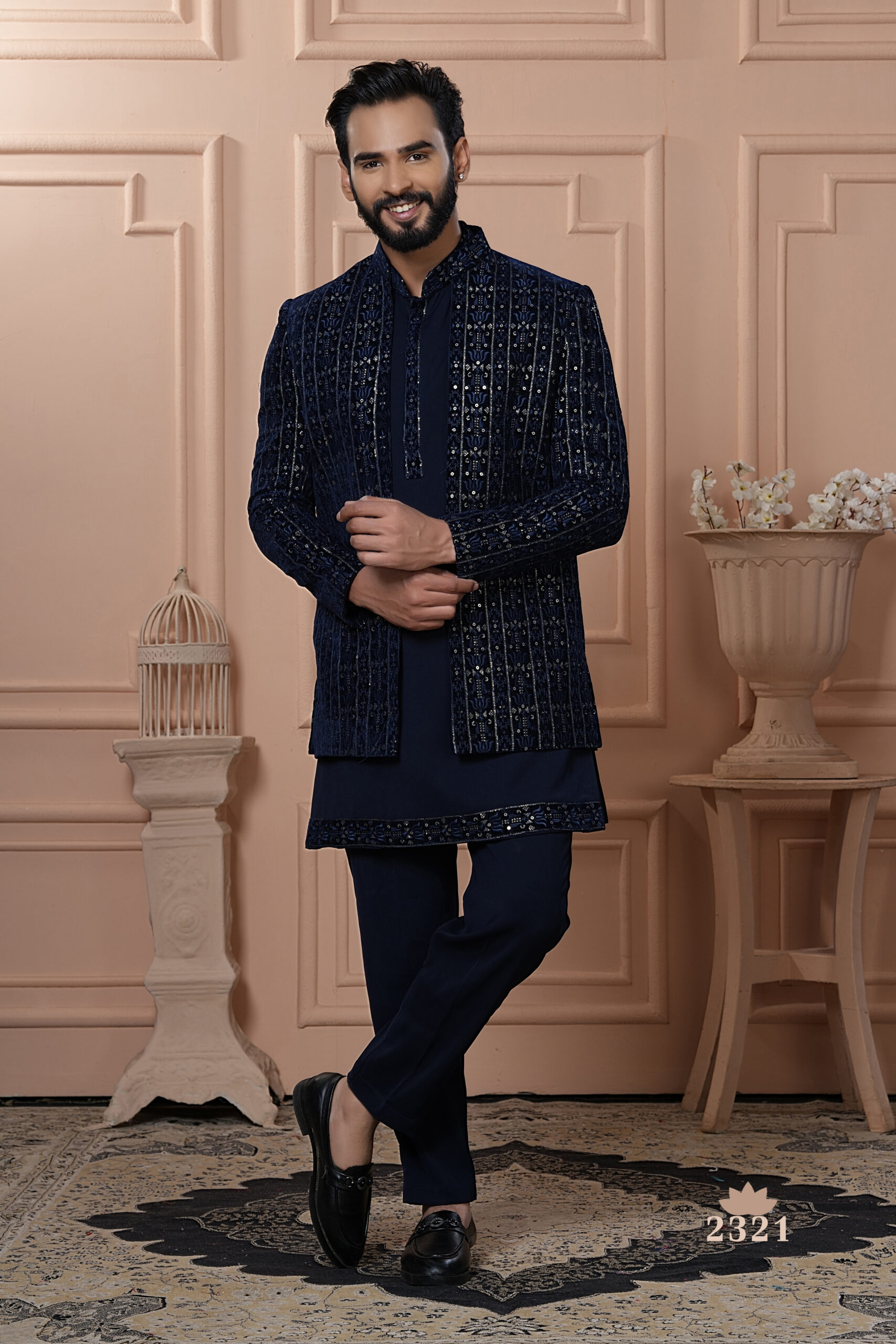 A regal navy blue Indo-Western featuring a velvet open-front jacket detailed with intricate thread embroidery and sequins. Paired with a matching kurta and trousers, this ensemble brings a rich and royal charm, perfect for weddings, receptions, and grand evening celebrations. The luxurious fabric and detailed work make it an elegant statement piece.