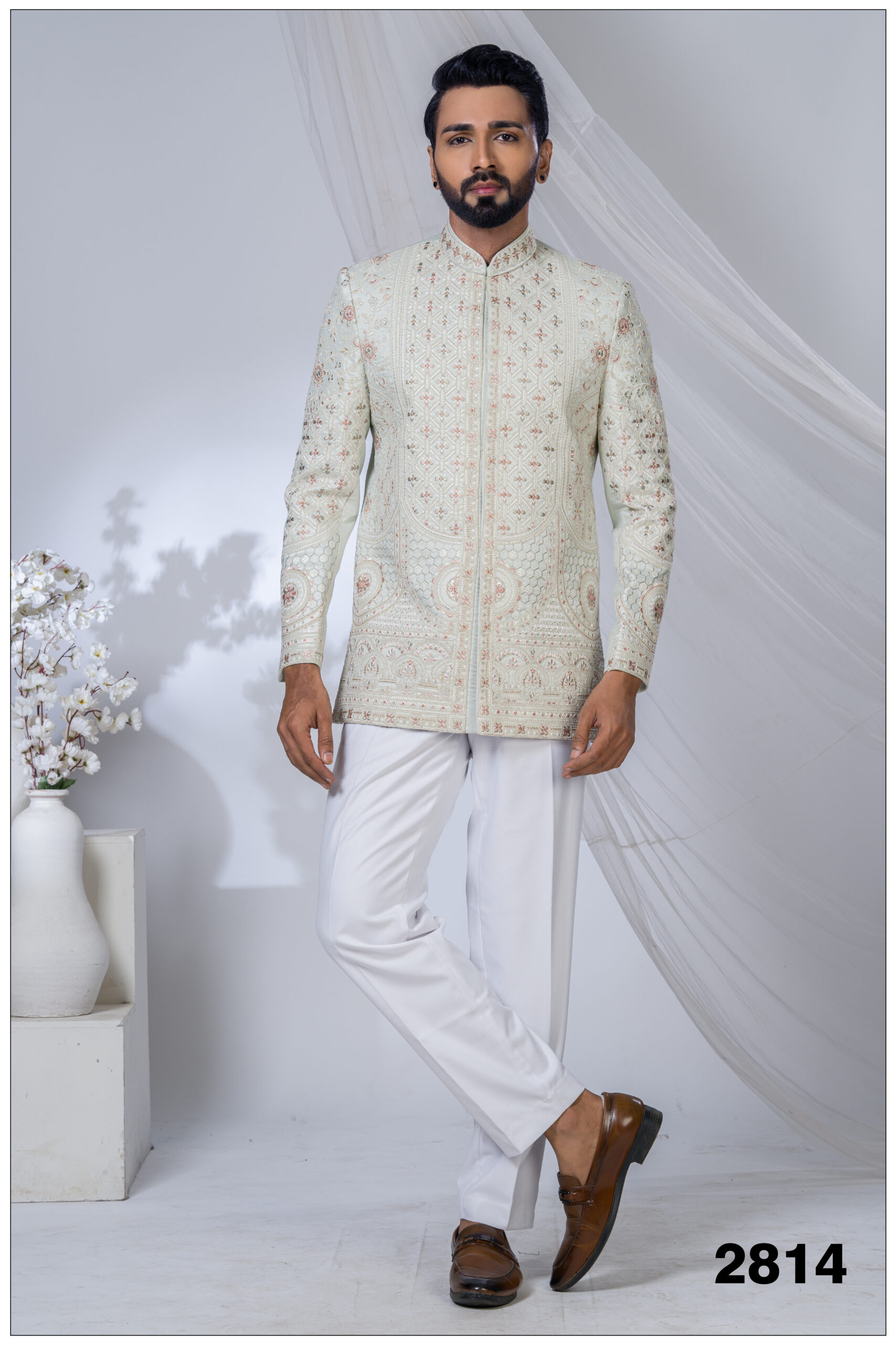 A sophisticated pastel-toned Jodhpuri suit adorned with intricate embroidery in subtle shades of peach and gold. Featuring a mandarin collar, front-button closure, and detailed geometric and floral patterns, this attire reflects royal elegance with modern finesse. Ideal for weddings, receptions, and grand occasions, it brings a touch of luxury and refinement to your style.