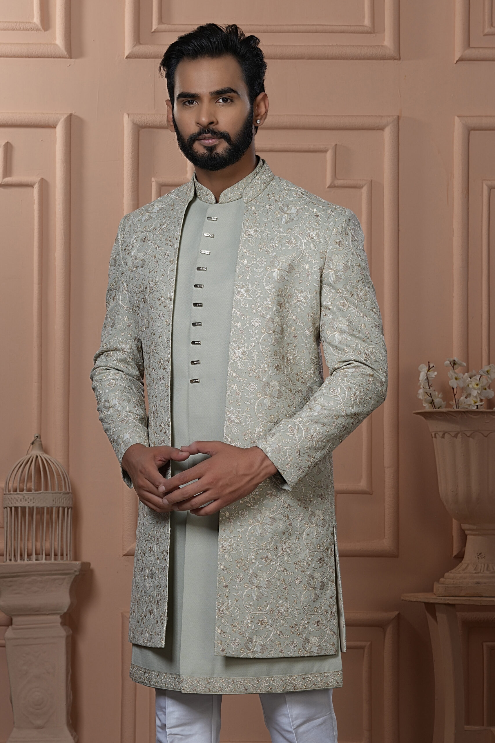 A refined pastel green Indo-Western ensemble featuring a front-open jacket richly adorned with floral embroidery in resham and zari work. Paired with a solid pastel kurta and white trousers, this outfit blends subtlety with regal elegance. Ideal for engagements, receptions, and festive occasions.