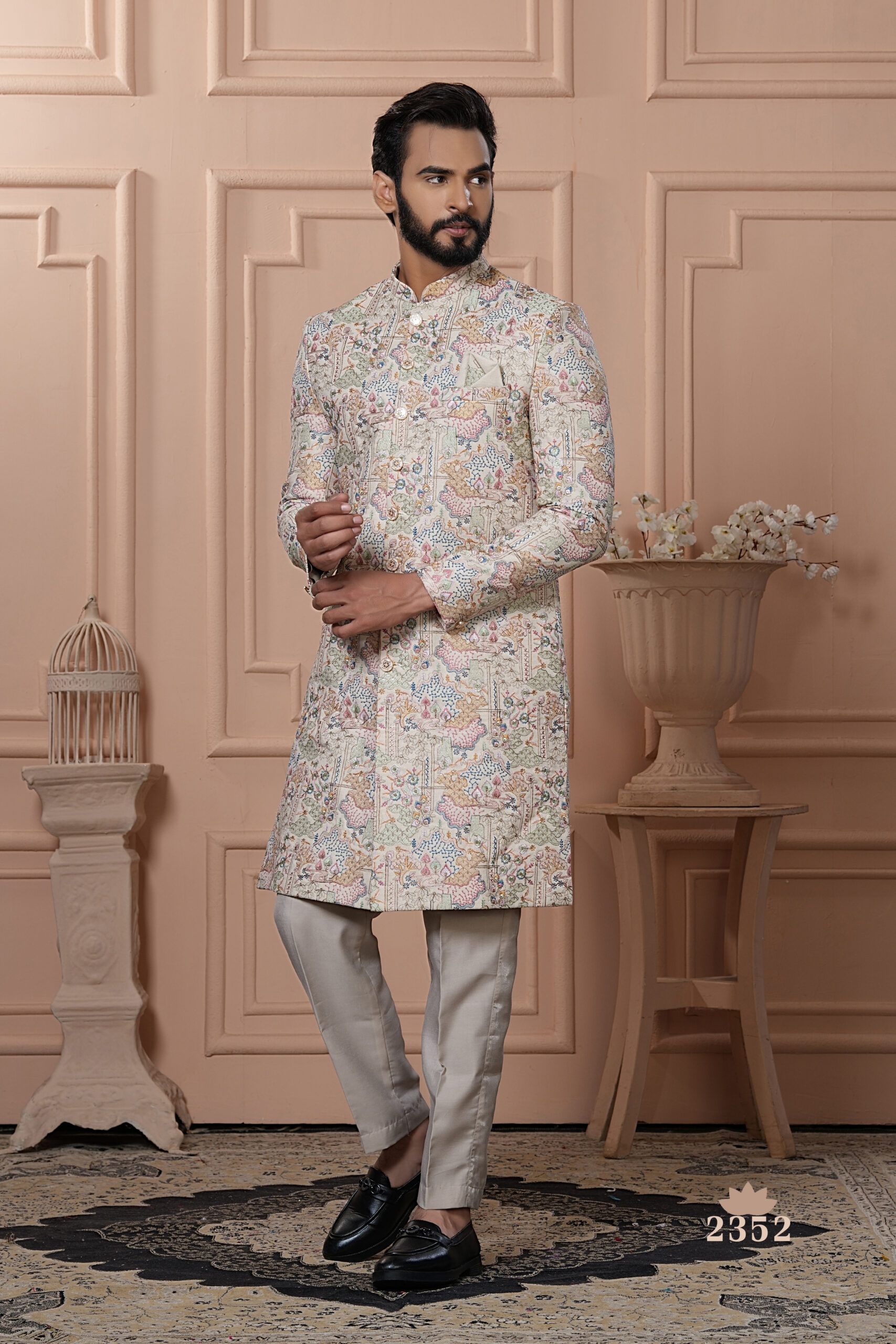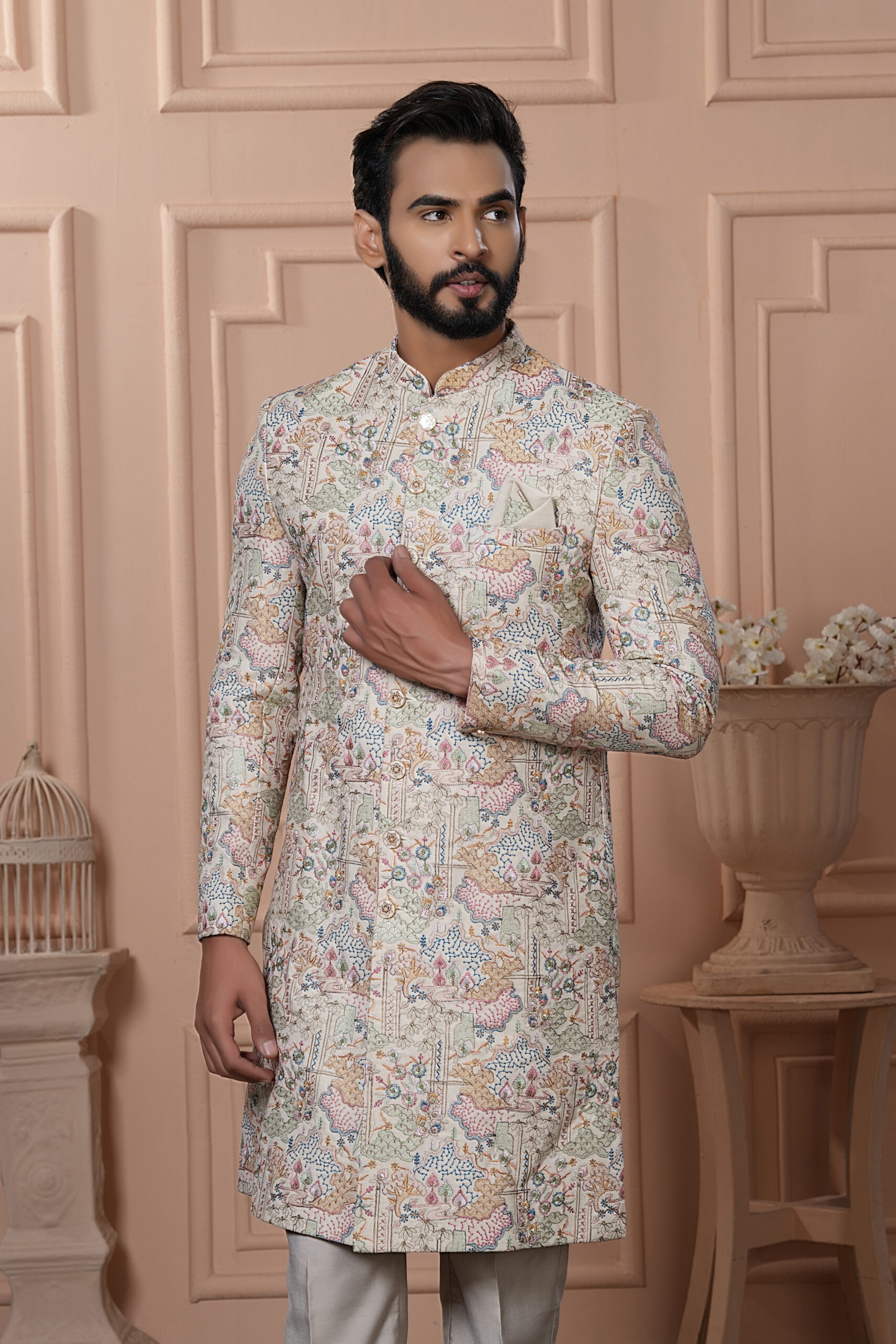 A sophisticated pastel Indo-Western ensemble featuring an all-over intricate print inspired by regal architecture and floral motifs. The muted tones of beige, mint, blush pink, and soft blue blend beautifully, creating a timeless and elegant appeal. Styled with a mandarin collar and classic button placket, this outfit is perfect for daytime weddings, sangeet, or festive occasions. The unique print work makes it a standout choice for those who prefer subtle yet striking ethnic wear.