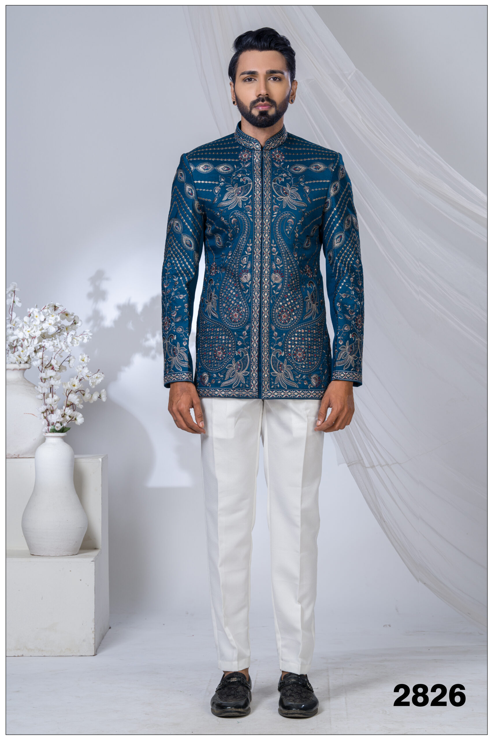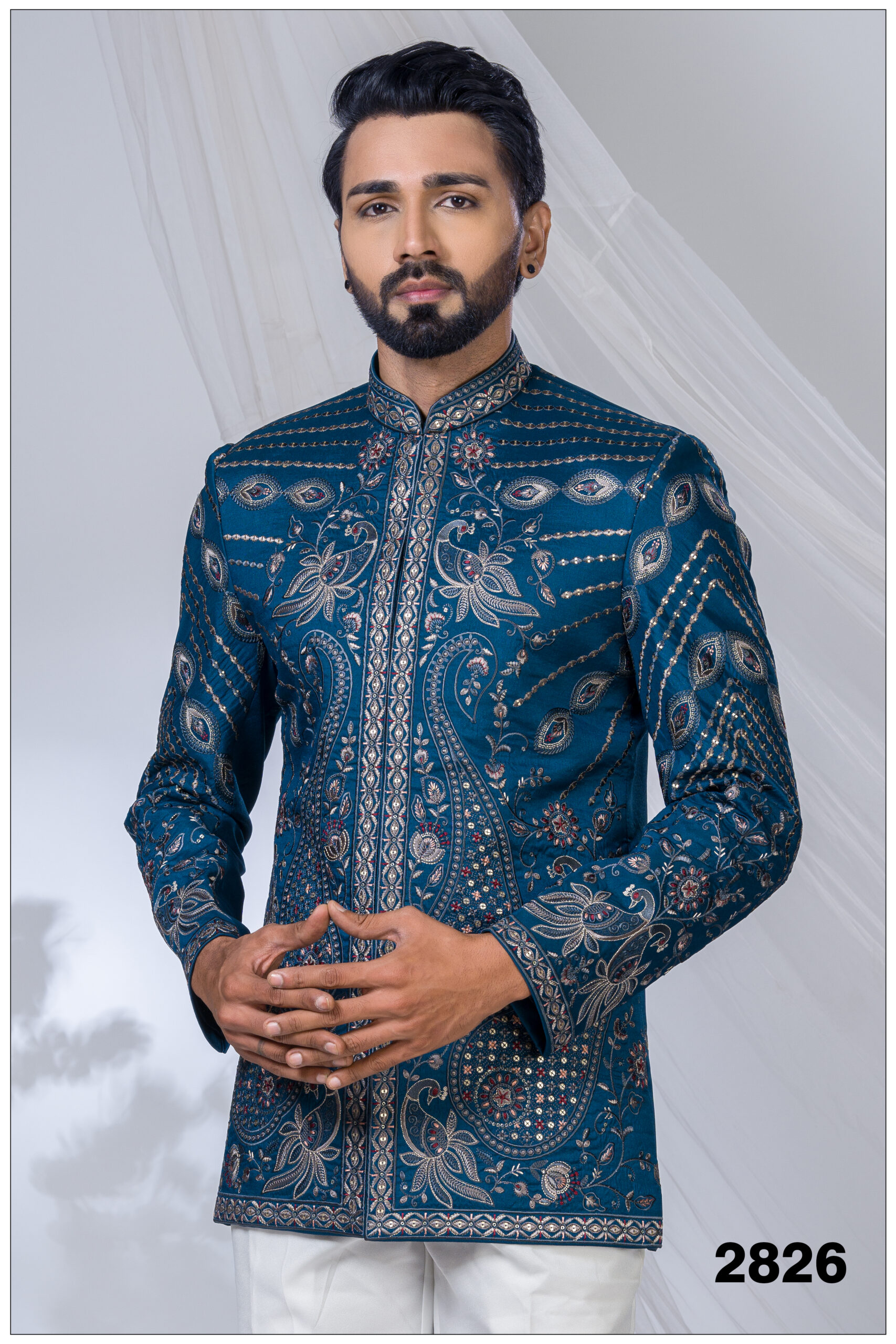 A majestic royal blue Jodhpuri suit adorned with intricate embroidery in resham and zari work, enhanced by sequin highlights. The floral and paisley motifs paired with a bandhgala collar give it a regal charm. Designed for weddings, engagements, and festive occasions, this piece beautifully blends traditional artistry with contemporary elegance.