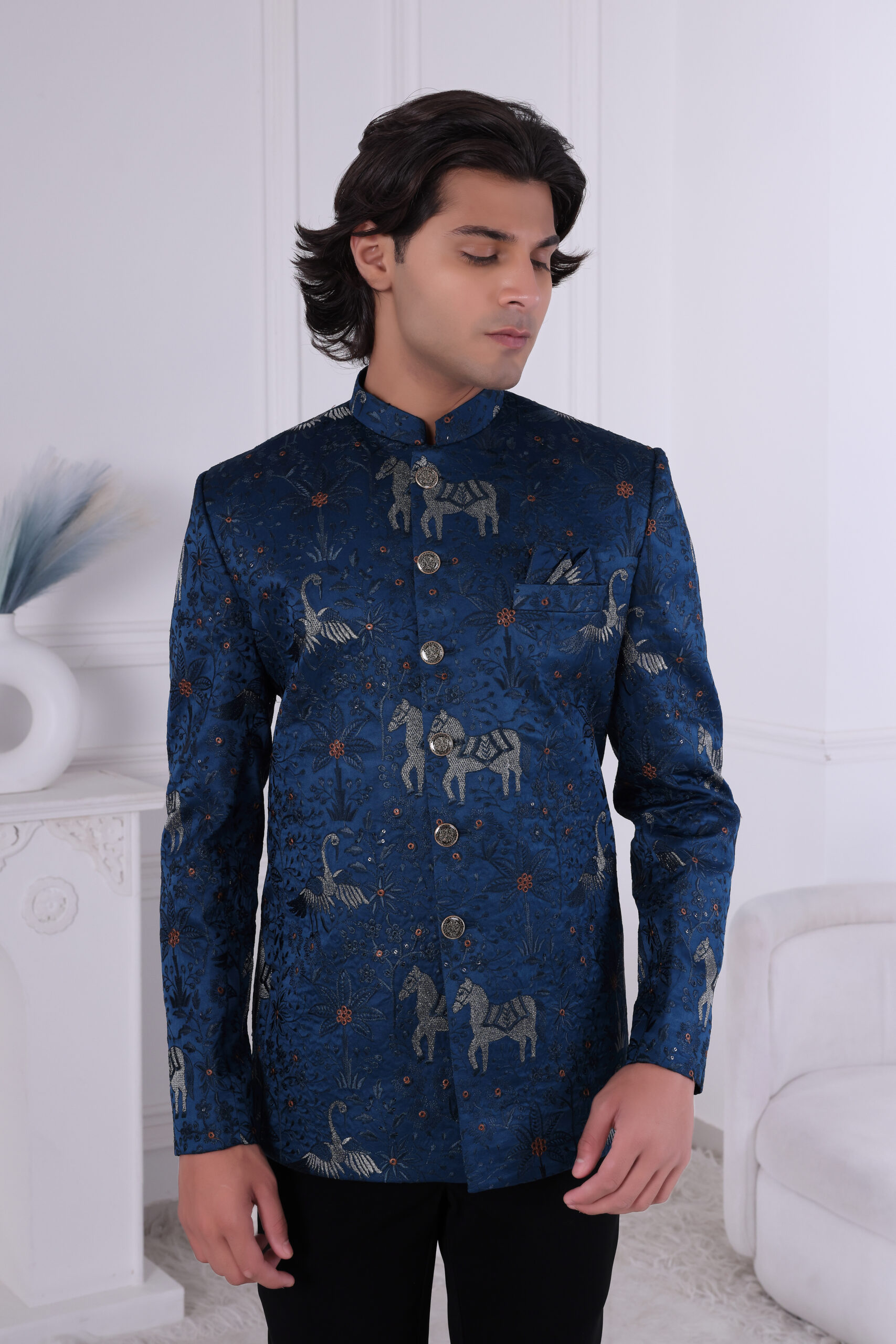 A statement-making Jodhpuri suit in rich royal blue silk, featuring intricate embroidery with animal and nature-inspired motifs, including horses and cranes. The detailed metallic accents, paired with ornate buttons, elevate its regal charm. Perfect for weddings, receptions, and festive occasions where tradition meets bold style.