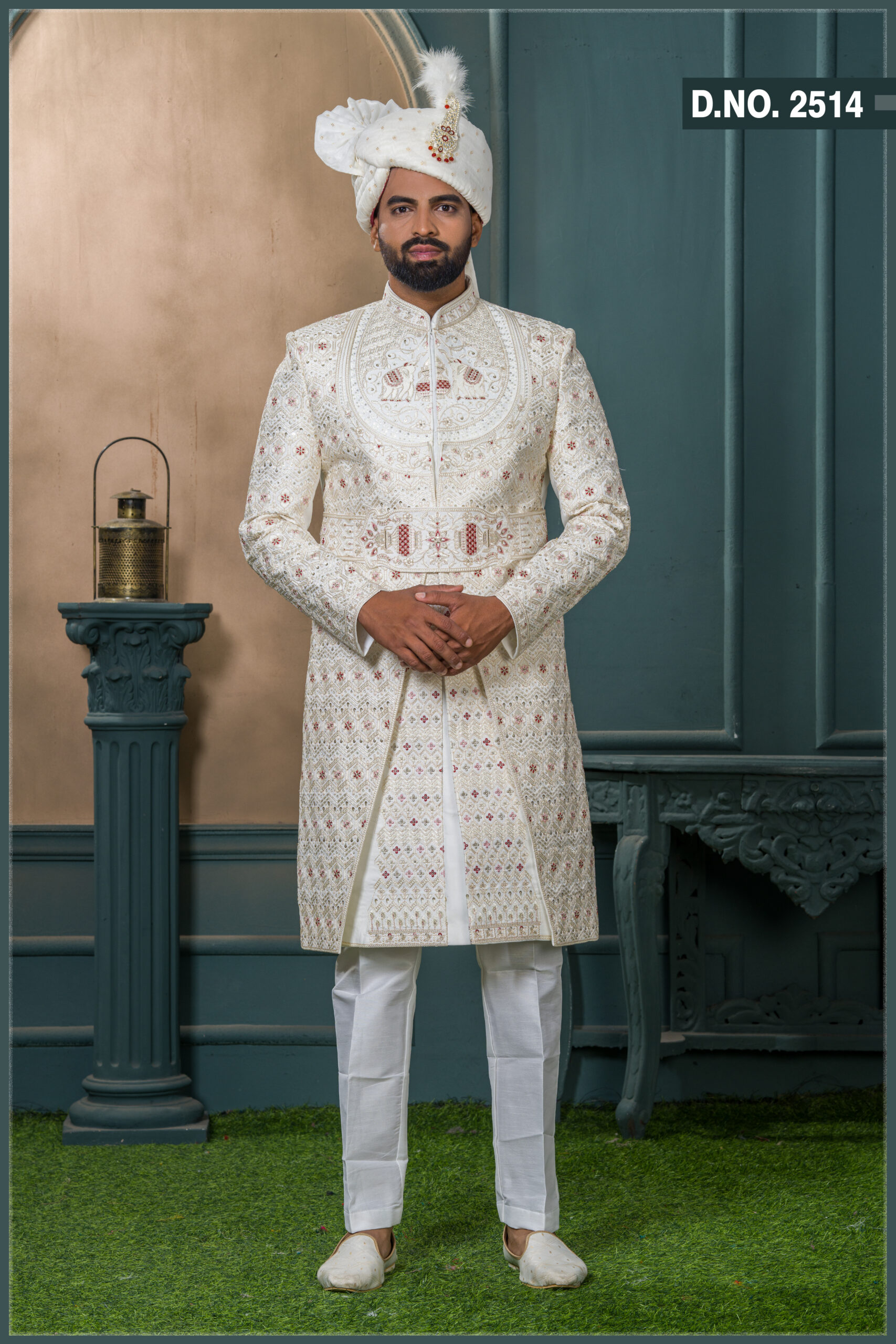 Royal Ivory Brocade Sherwani with Handcrafted Elephant Motif Embroidery