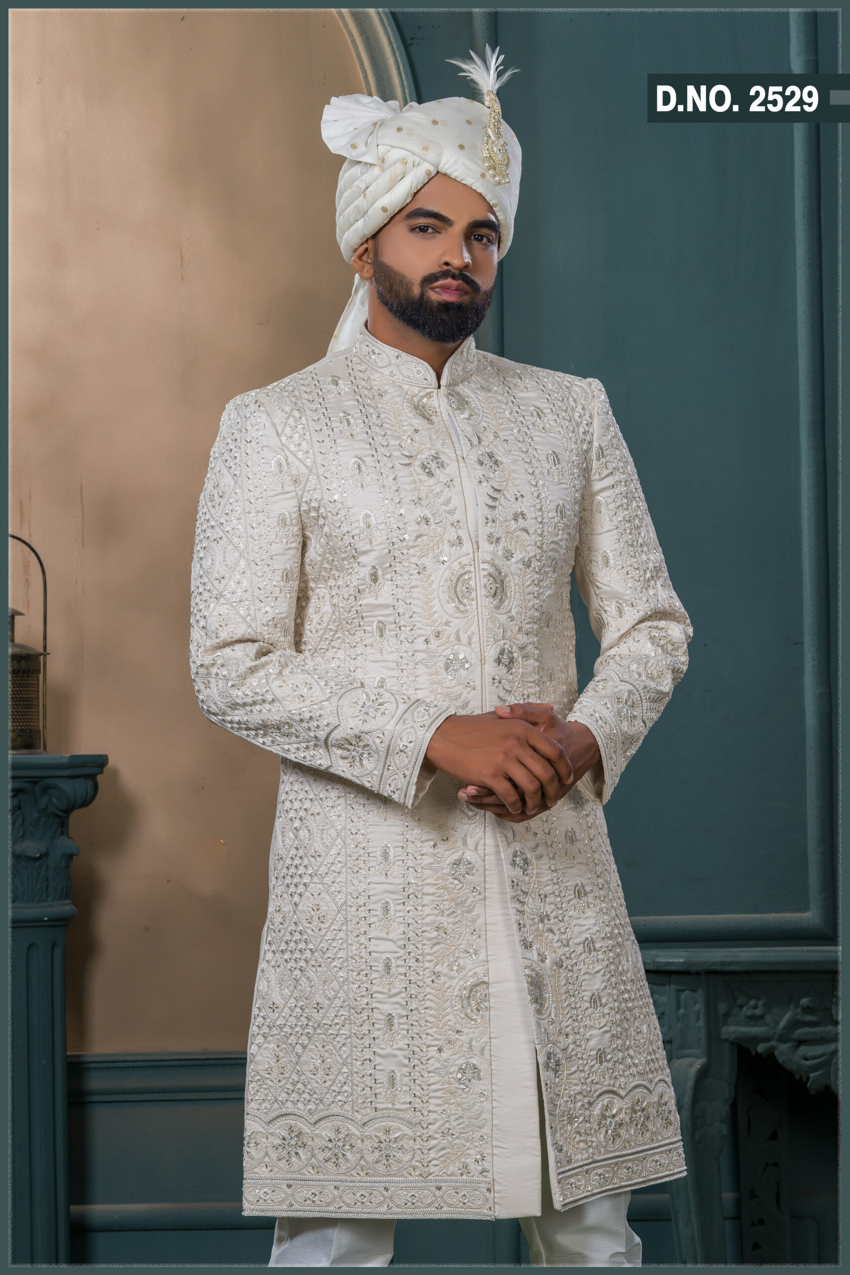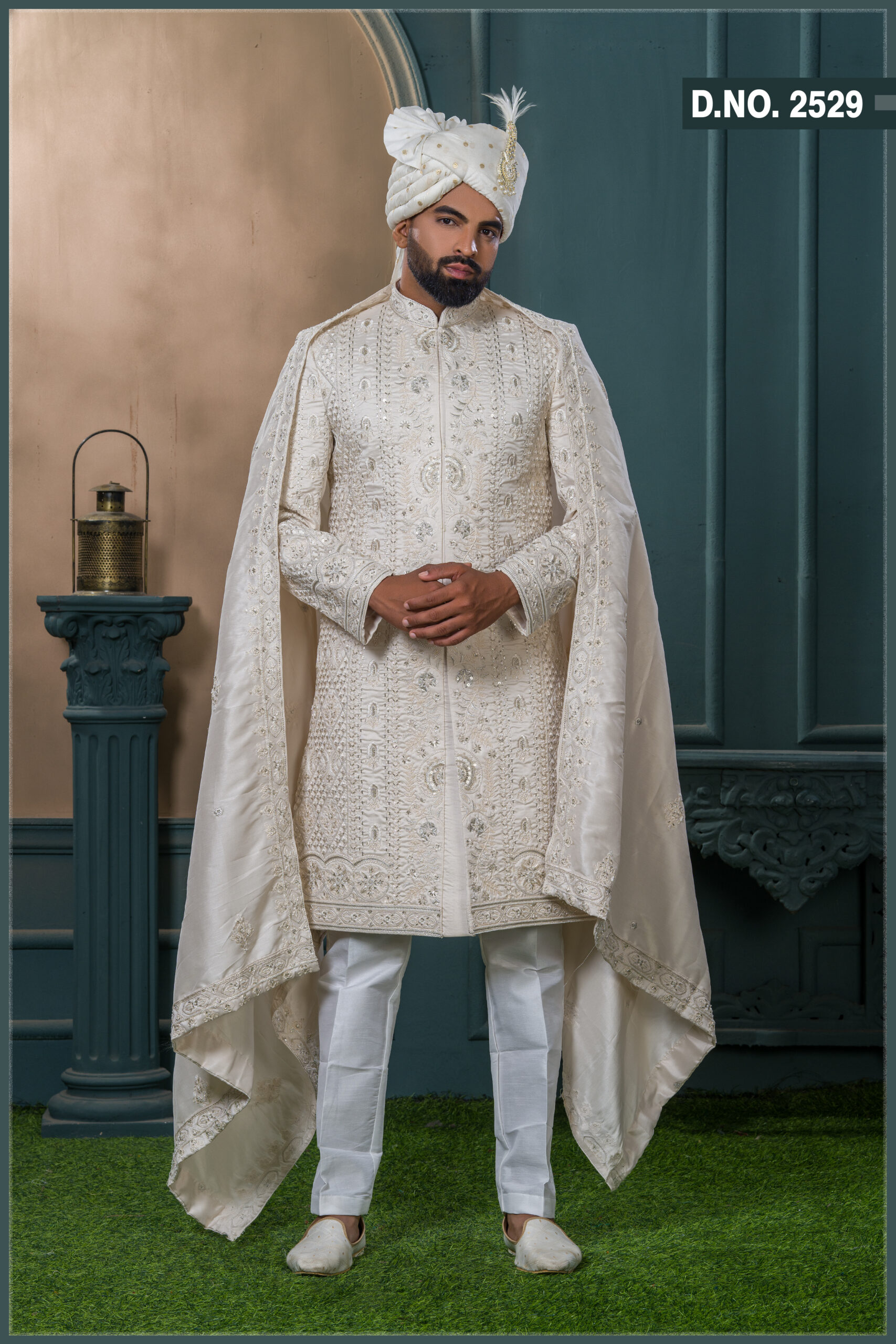 Royal Ivory Mirror-Work Sherwani with Intricate Embroidery