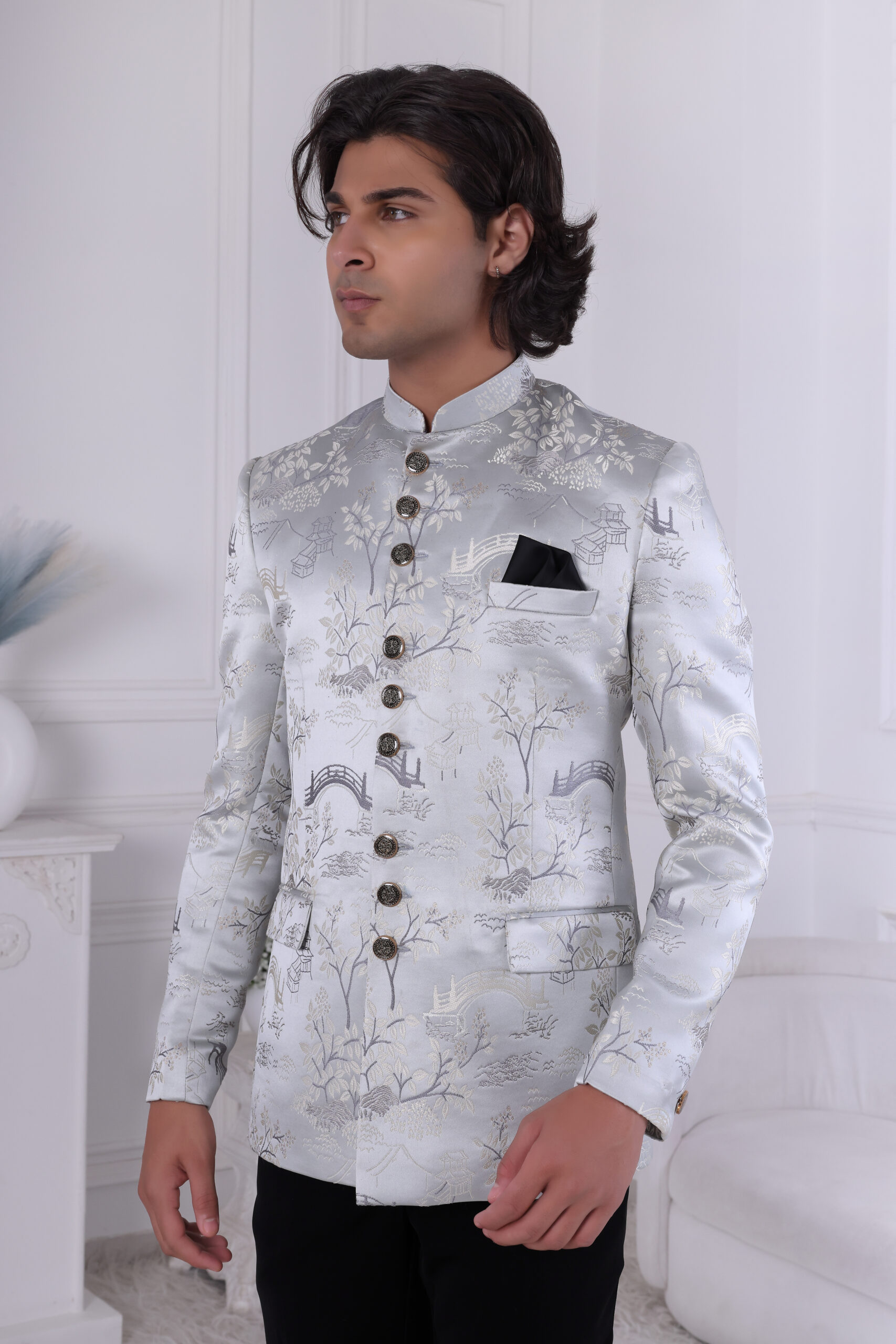 Stylish silver Jodhpuri suit featuring intricate brocade patterns, ornate buttons, and a sleek black pocket square, ideal for weddings and grand celebrations.