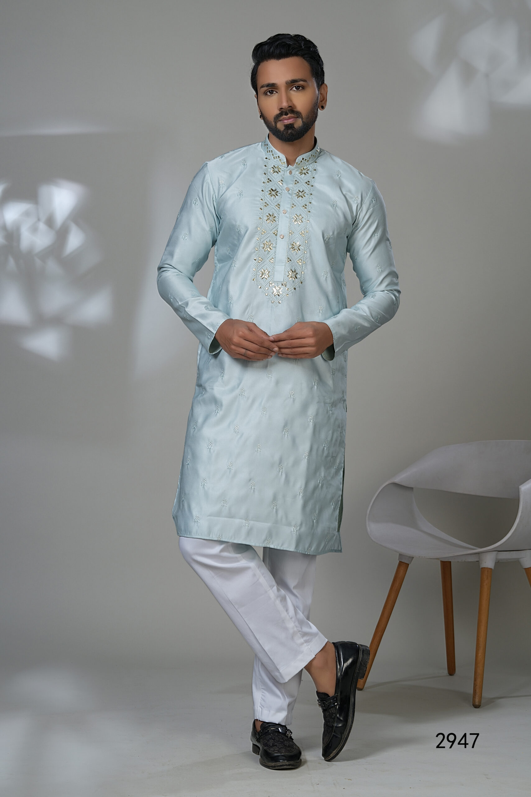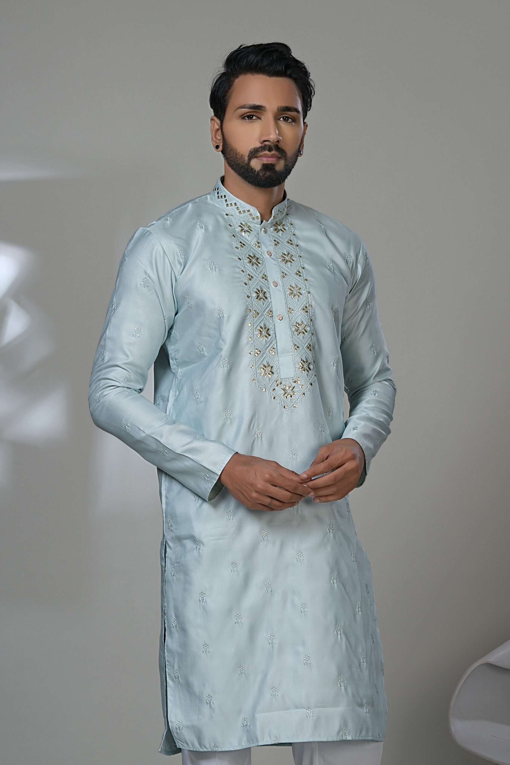 Radiate charm in this elegant sky blue silk kurta, featuring subtle all-over thread embroidery and a beautifully embellished placket. Its refined design and soft sheen make it perfect for festive occasions, mehendi events, and formal gatherings.