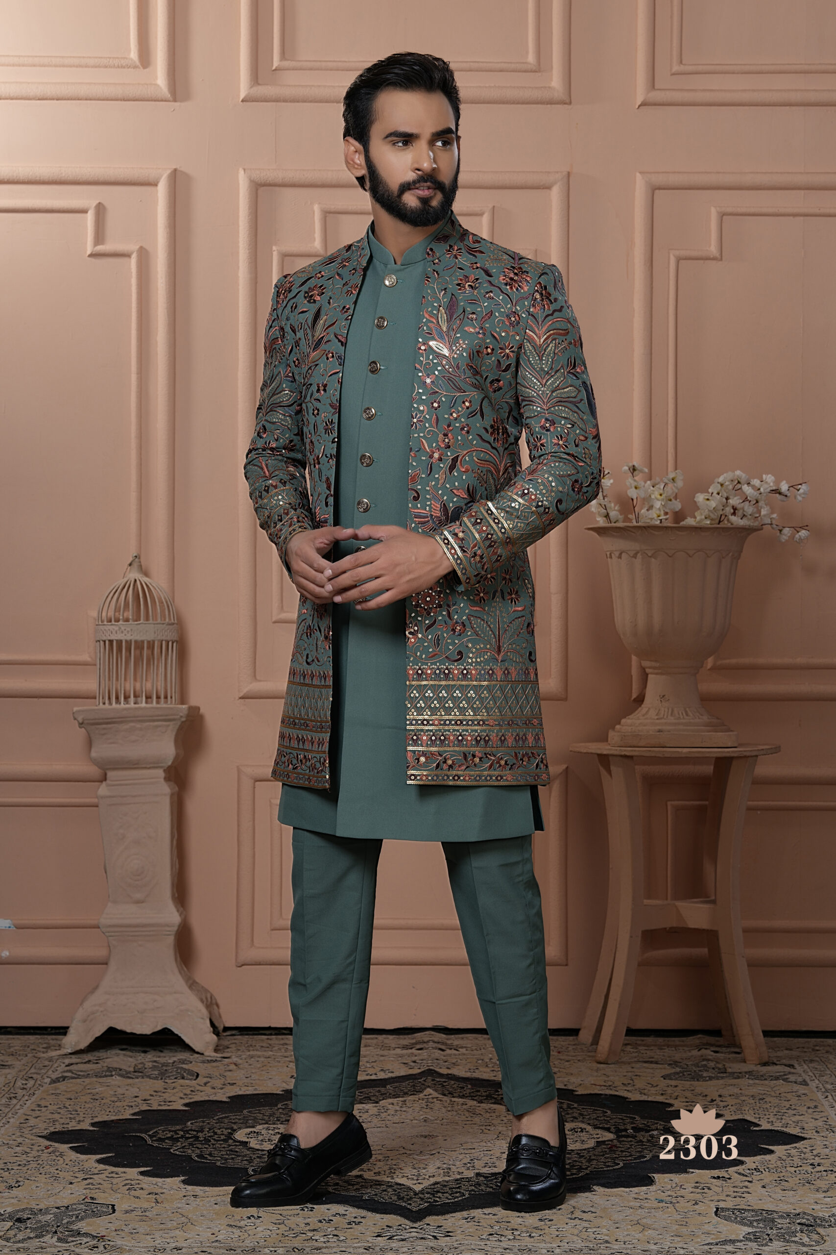 Make a royal statement with this teal green Indo-Western set, featuring a front-open embroidered jacket beautifully adorned with floral and geometric motifs, enhanced with shimmering sequin work. Paired with a matching kurta and trouser set, this ensemble exudes elegance, making it ideal for weddings, receptions, and grand festive occasions.